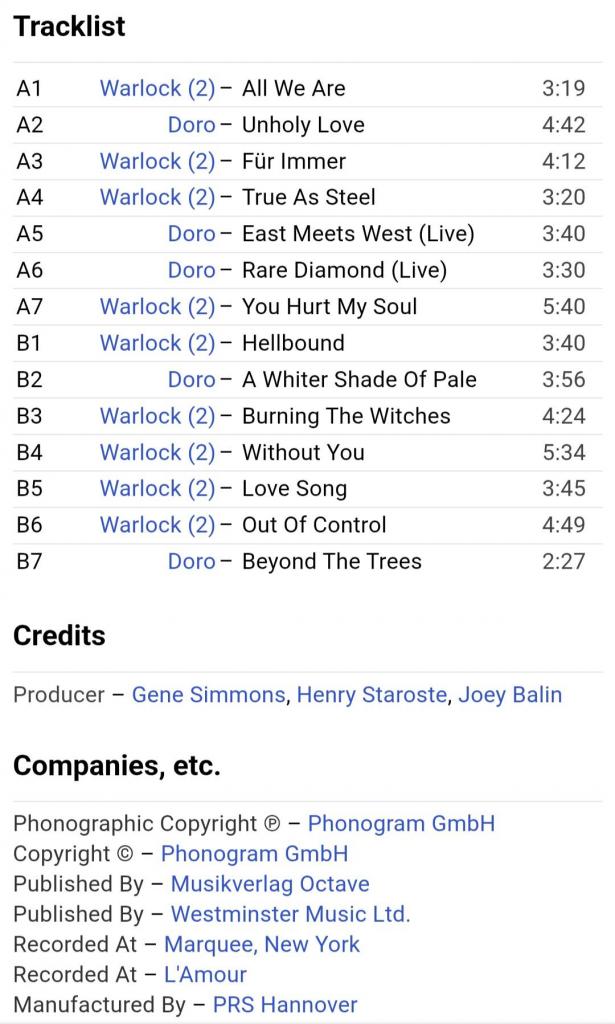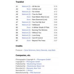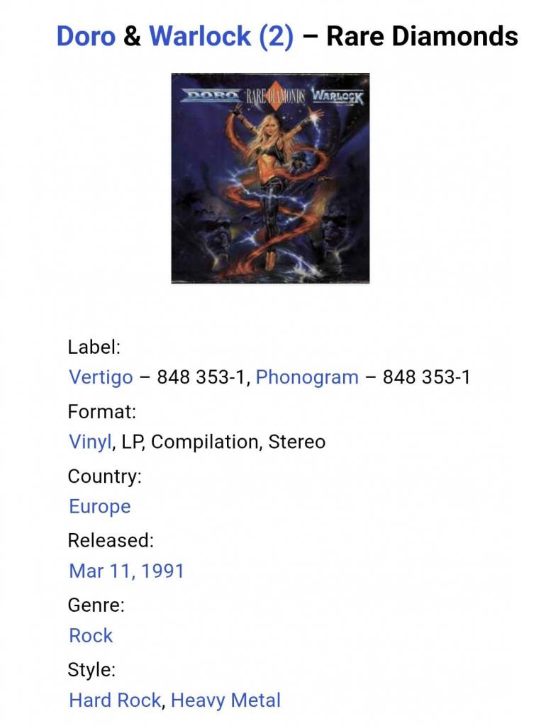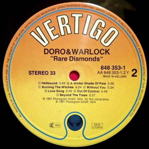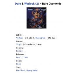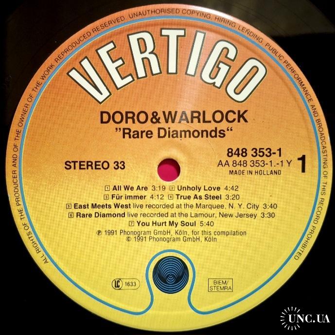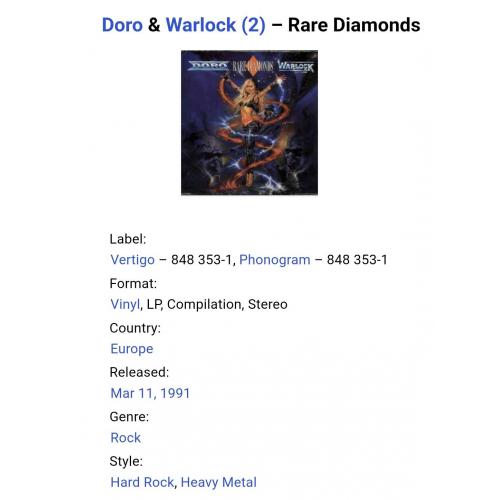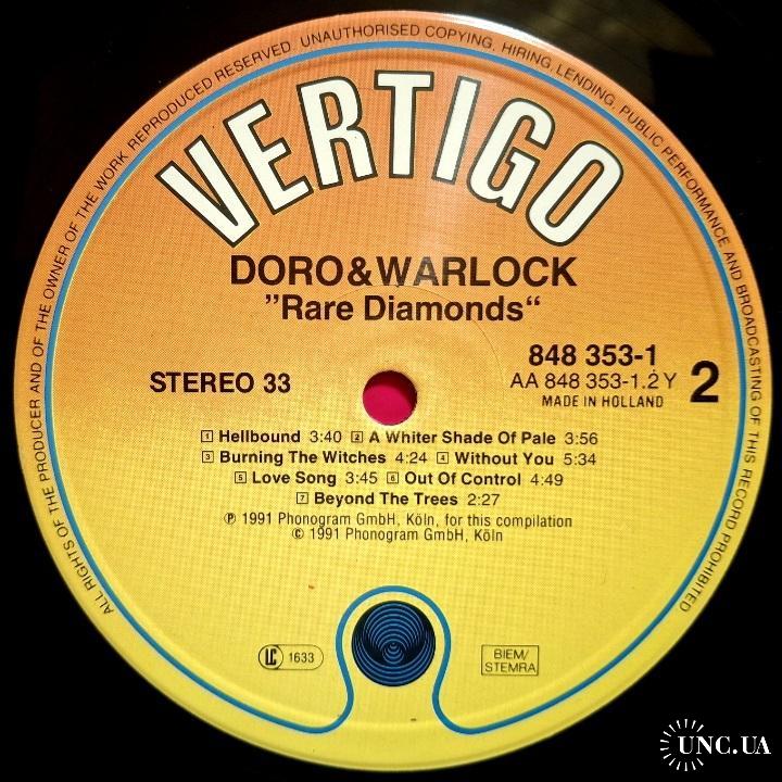 Вінілова платівка. Перша, в дискографії, офіційна студійна збірка найкращих хітів, Німецької хеві метал групи Doro & Warlock, до складу якої, на той період часу, входили Доро Пеш, Руді Граф, Петер Сзігеті, Франк Ріттель, Ніко Арванітіс, Томмі Болан, Томмі Хенріксен та Міхаель Еуріх (Rare Diamonds) 1983-91. Випуск фірми (Vertigo / Phonogram) Holland, 1991-ий рік. Оригінальне, першопресове Нідерландське видання. Стан платівки NM-. Конверт глянцевий. Стан конверту ЕХ+. В комплекті внутрішня вставка (OIS). Відправка по Україні службами доставки: Нова Пошта, Укр Пошта, Делівері. Також відправляємо посилки за кордон по цілому світу.