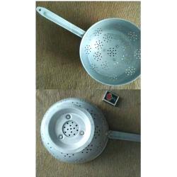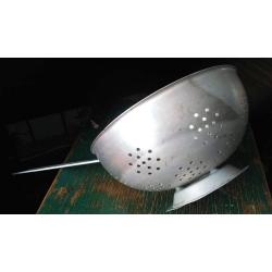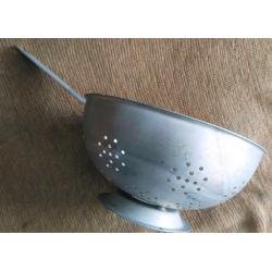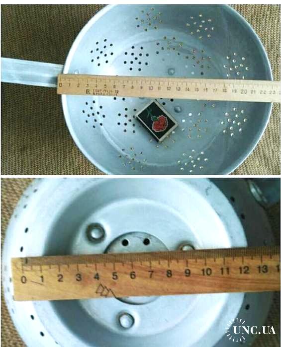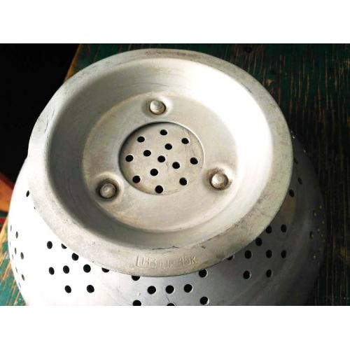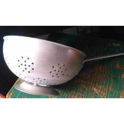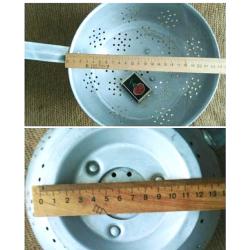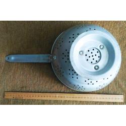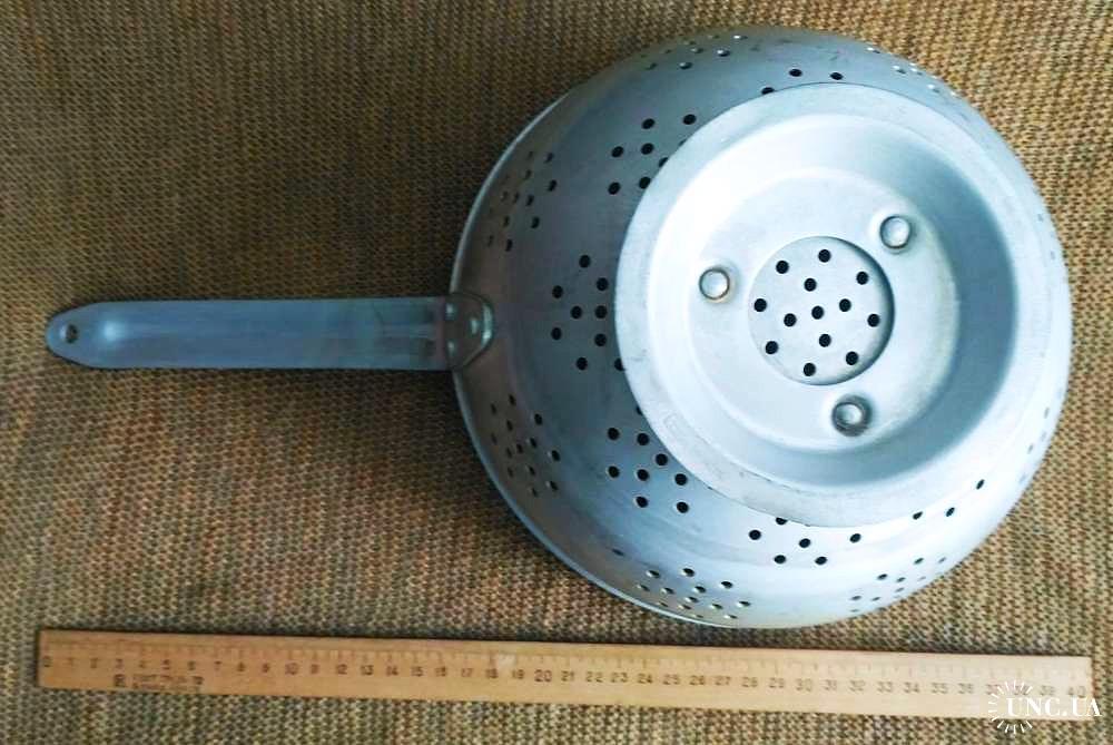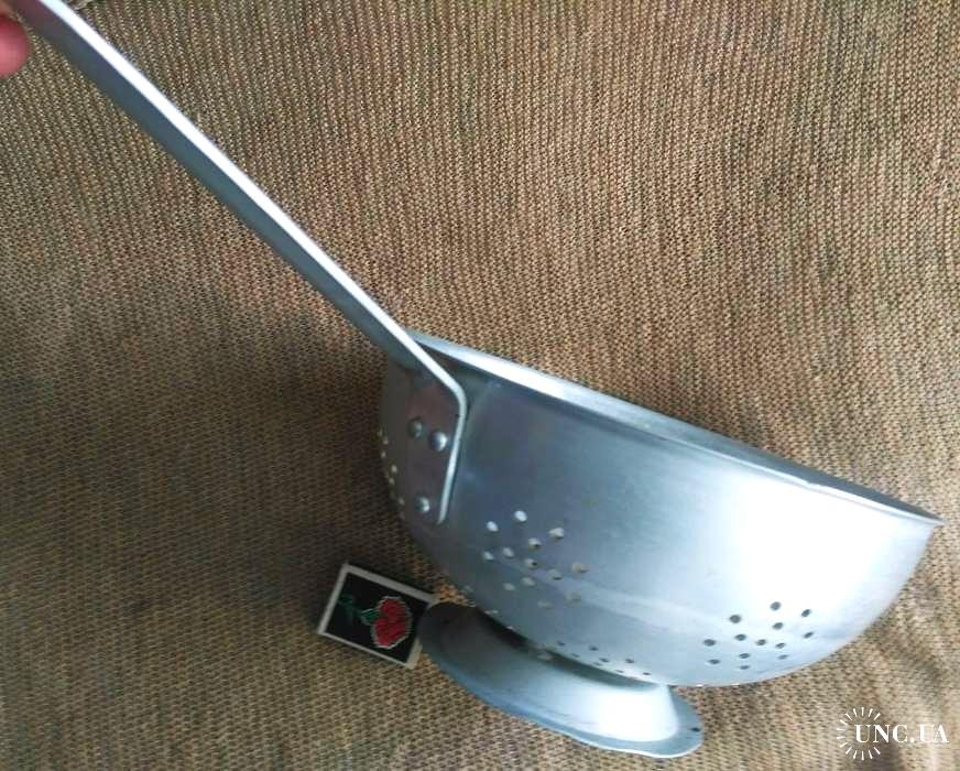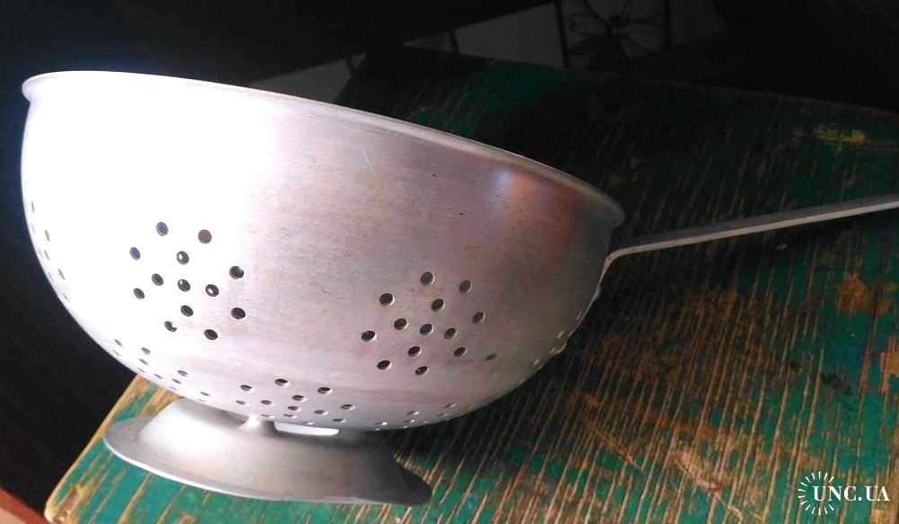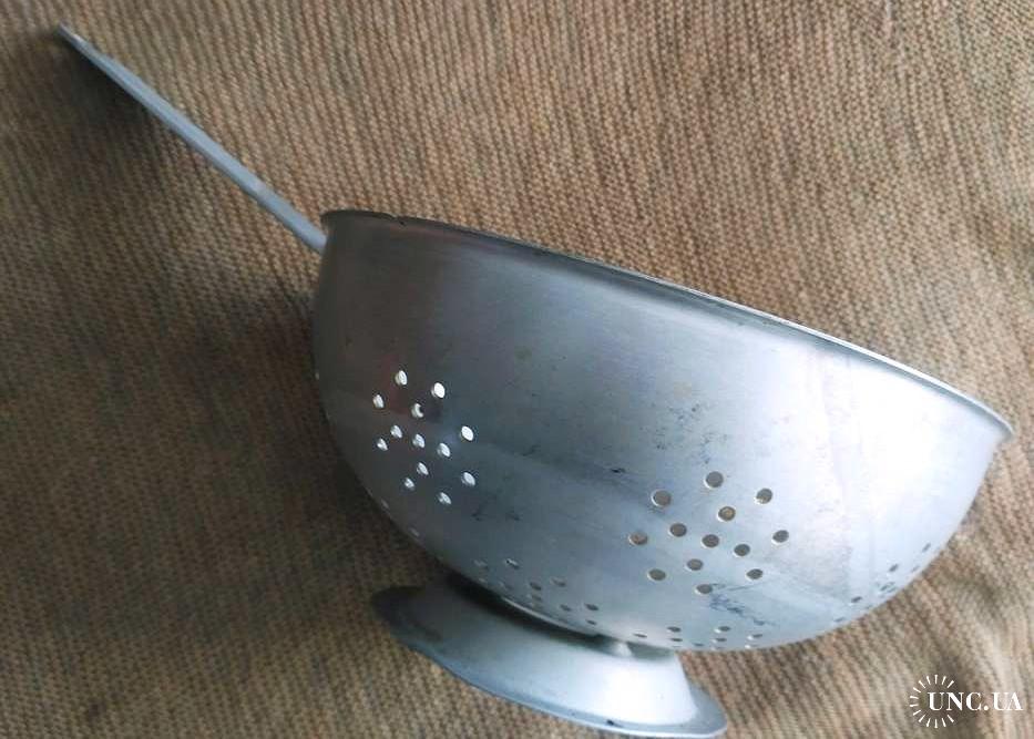 Дуршляг прочный, удобный, белый металл , алюминий, винтажный. Клеймо НЗ цена 1 р, 45 к, б\у , в хорошем состоянии. Пролежал много лет на антресолях, хорошая сохранность, незначительные следы времени на металле. Металл толстый.