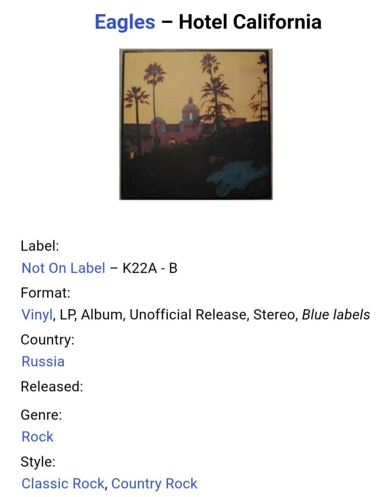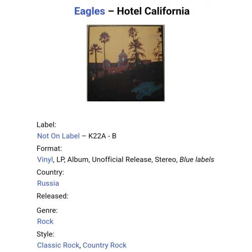 1961-1980Вінілова платівка. П,ятий, студійний каталожний альбом Американської кантрі фольк-рок групи Eagles (Hotel California) 1976. Випуск фірми (Santa Records) Russia, 1993-ій рік. Стан платівки ЕХ+. Стан конверту EX+. Відправка по Україні службами доставки: Нова Пошта, Укр Пошта, Делівері. Також відправляємо посилки за кордон по цілому світу.