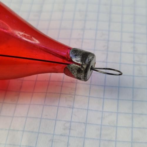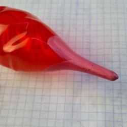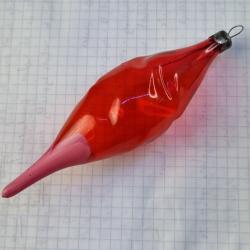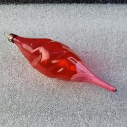 Скляна ялинкова прикраса у формі витягнутої краплі з хвилястими вигинами. Виготовлена з прозорого червоного скла з рожевим наконечником. Має металеву ковпачку з петелькою для підвішування. Прикраса виглядає ефектно завдяки глянцевій поверхні та грі світла всередині скла.