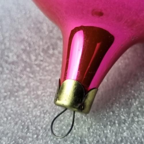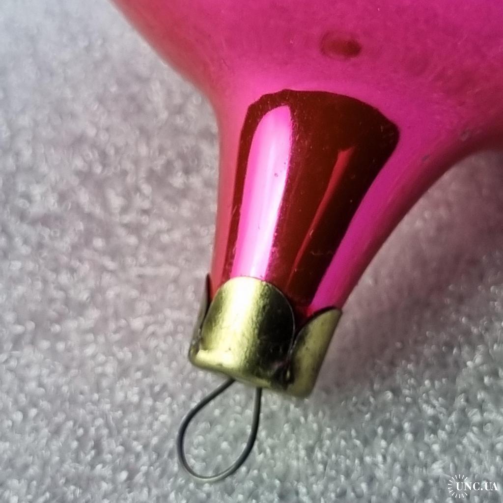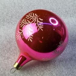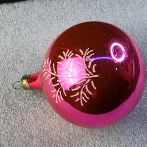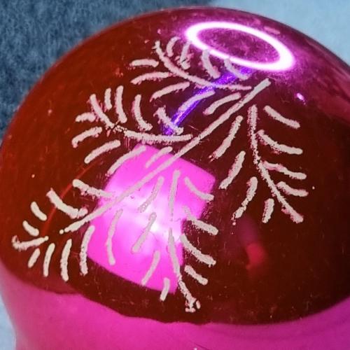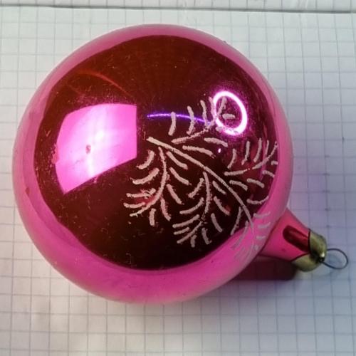 Скляна ялинкова прикраса рожево-червоного кольору з глянцевим покриттям. Декорована білим візерунком у вигляді гілочок ялини. Має характерну витягнуту нижню частину та металевий ковпачок із петелькою для підвішування. Виріб із колекційної серії, ймовірно, виробництва СРСР 1970–1980-х років. Добре відображає світло, створюючи святкову атмосферу.