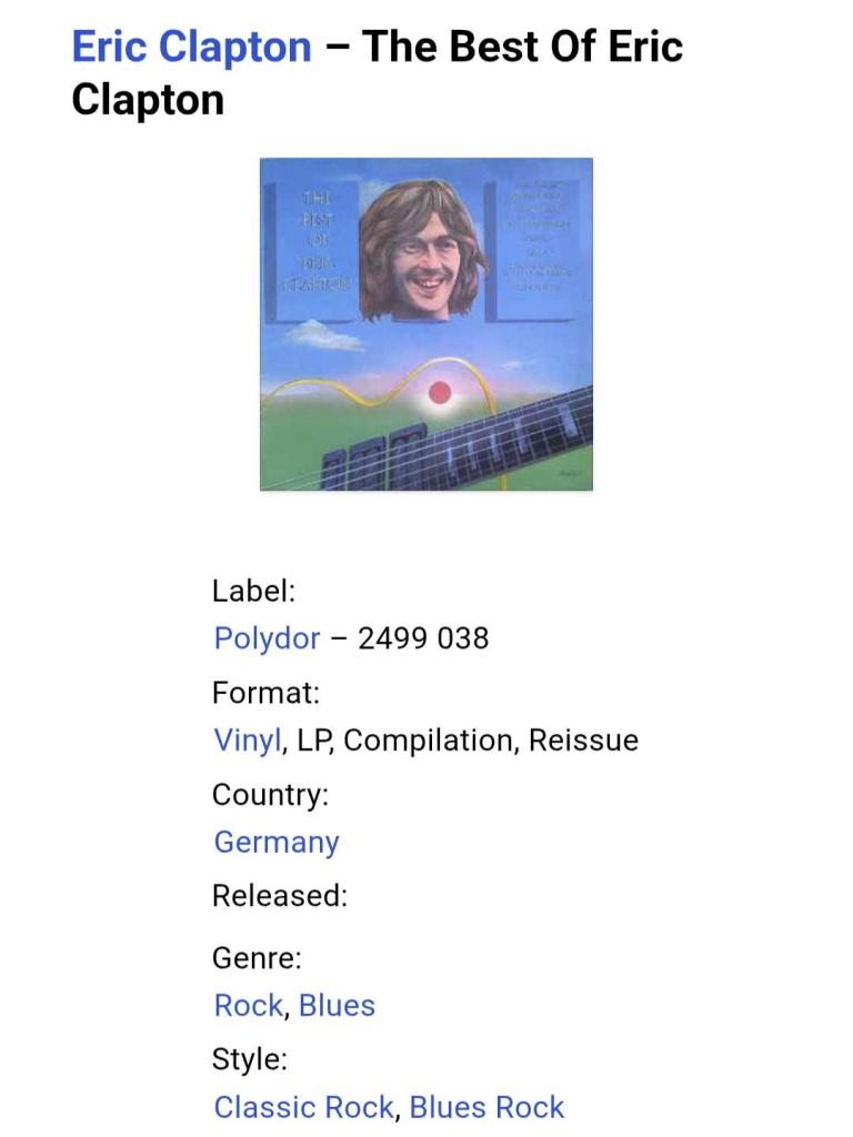 Вінілова платівка. Офіційна збірка найкращих ранніх хітів, командора Ордена Британської імперії, лауреата багатьох премій Греммі, найвпливовішого діяча в рок-музиці, Англійського блюз-рок виконавця Еріка Клептона (The Best Of Eric Clapton) 1970-72. Випуск фірми (Polydor) Germany, 1972-ий рік. Оригінальне Німецьке видання. Стан платівки ЕХ+. Конверт глянцевий. Стан конверту ЕХ+. Відправка по Україні службами доставки: Нова Пошта, Укр Пошта, Делівері. Також відправляємо посилки за кордон по цілому світу.