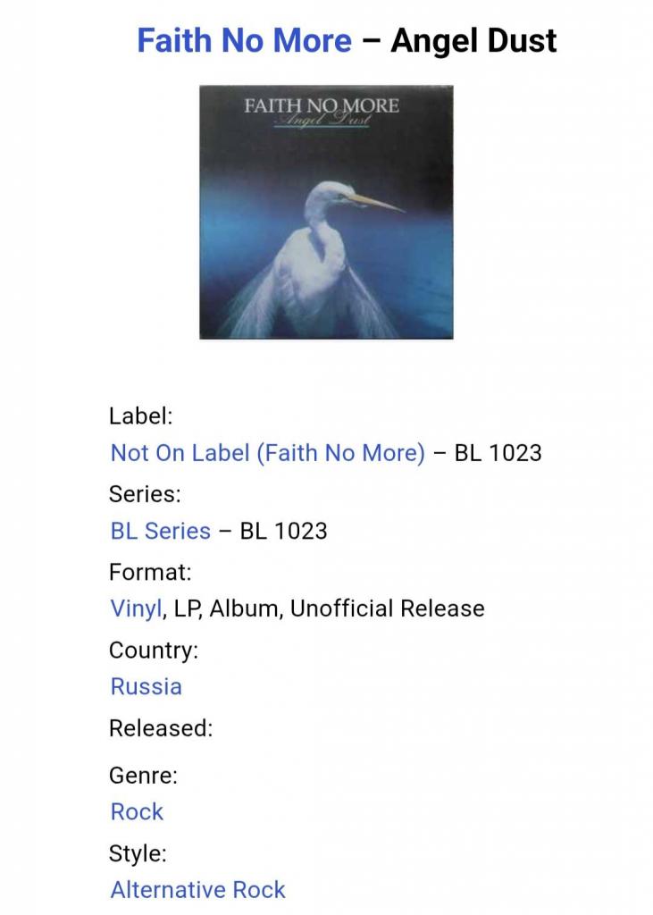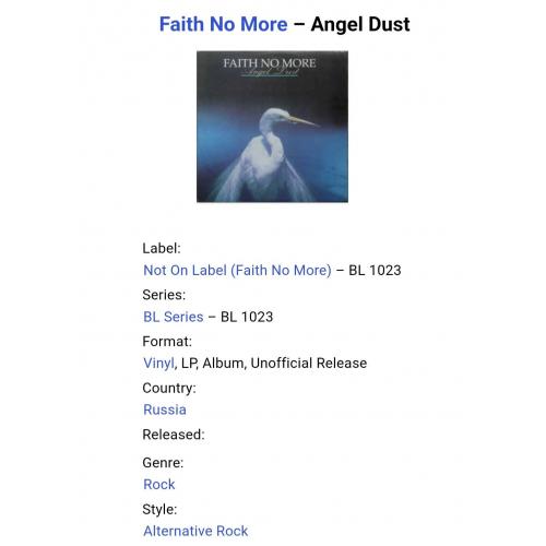 Вінілова платівка. Четвертий, в дискографії, студійний альбом, Американської авангард-метал, джаз-ф'южн, репкор групи із Сан-Франциско, Faith No More, до складу якої входили Майк Паттон, Джим Мартін, Біллі Гулд, Родді Боттум та Майк Бордін (Angel Dust) 1992. Неофіційне видання (Unofficial Release). Випущено невідомою фірмою в 1992-му році. Стан платівки NM-. Стан конверту NM-. Відправка по Україні службами доставки: Нова Пошта, Укр Пошта, Делівері. Також відправляємо посилки за кордон по цілому світу.