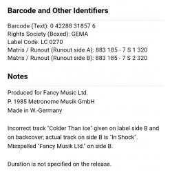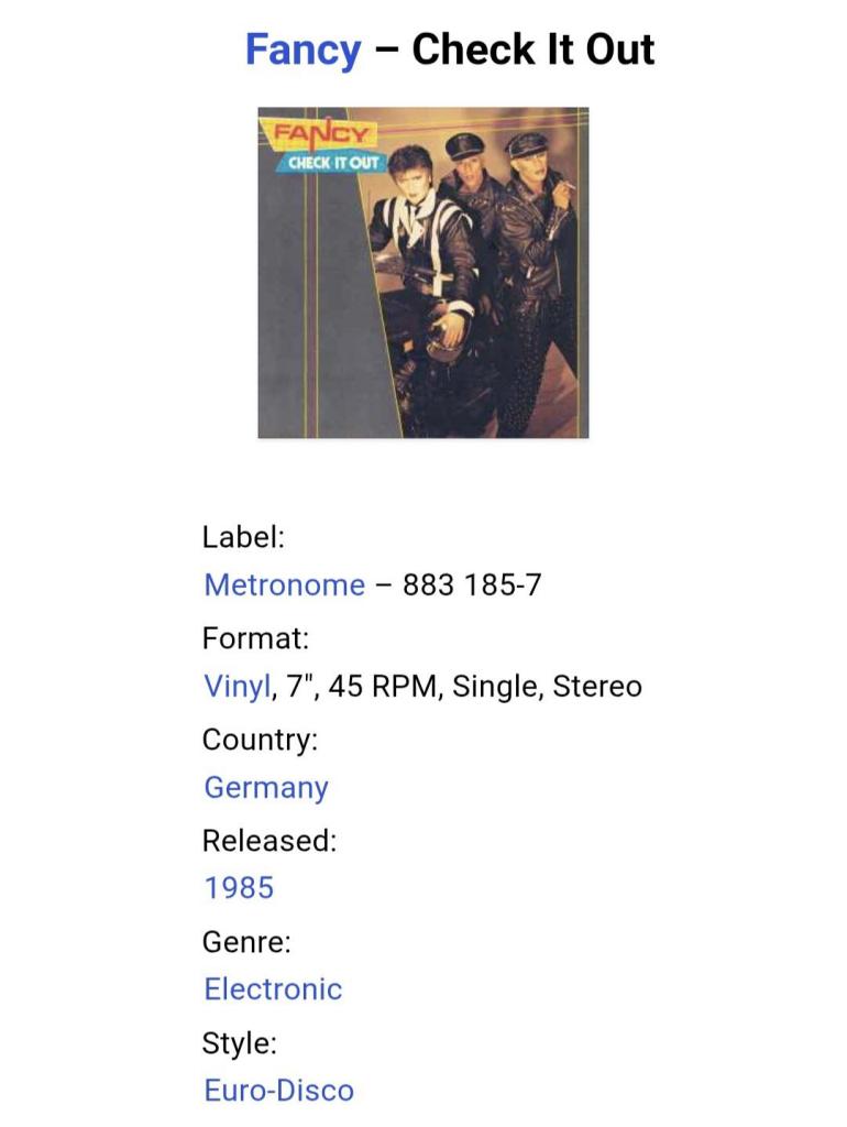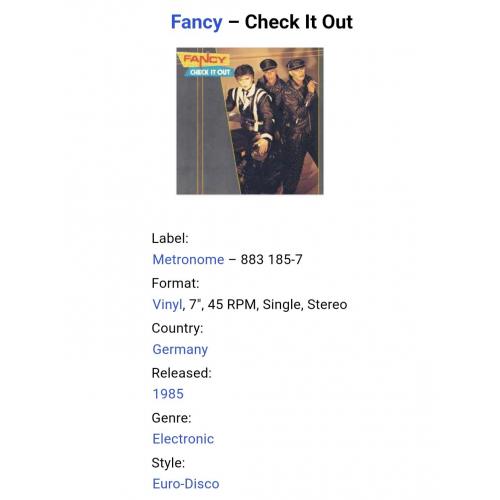 1981-2000Вінілова платівка. П'ятий, в дискографії, студійний міні сингл (EP 7), Німецького євро диско виконавця, Манфреда Алоїс Зегіта, більше відомого під сценічним ім,ям Fancy (Check It Out) 1985. Випуск фірми (Metronome) Germany, 1985-ий рік. Оригінальне, рідне, першопресове Німецьке видання. Стан платівки EX+/EX. Стан конверту ЕХ+. Відправка по Україні службами доставки: Нова Пошта, Укр Пошта, Делівері. Також відправляємо посилки за кордон по цілому світу.