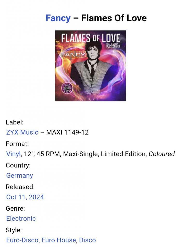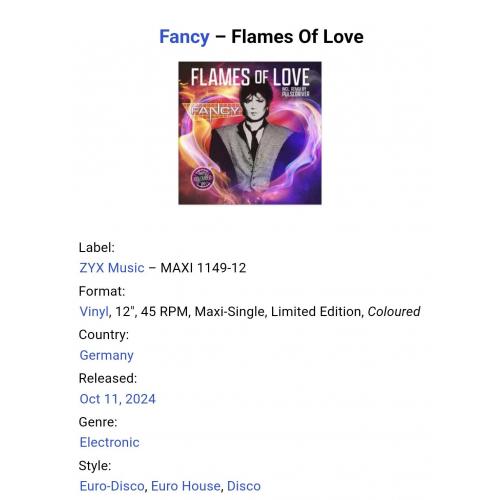 Вінілова платівка. П,ятдесятий в дискографії, студійний максі сингл (EP 12), Німецького євро диско виконавця, Манфреда Алоїс Зегіта, більше відомого під сценічним ім,ям Fancy (Flames Of Love. Pulsedriver Remix) 2023. Випуск фірми (Zyx Music) Germany, 2024-ий рік. Кольоровий вініл (Coloured Vinyl). Лімітований тираж (Limited Edition). Видання нове, запаковане. Категорія S/S. Відправка по Україні службами доставки: Нова Пошта, Укр Пошта, Делівері. Також відправляємо посилки за кордон по цілому світу.