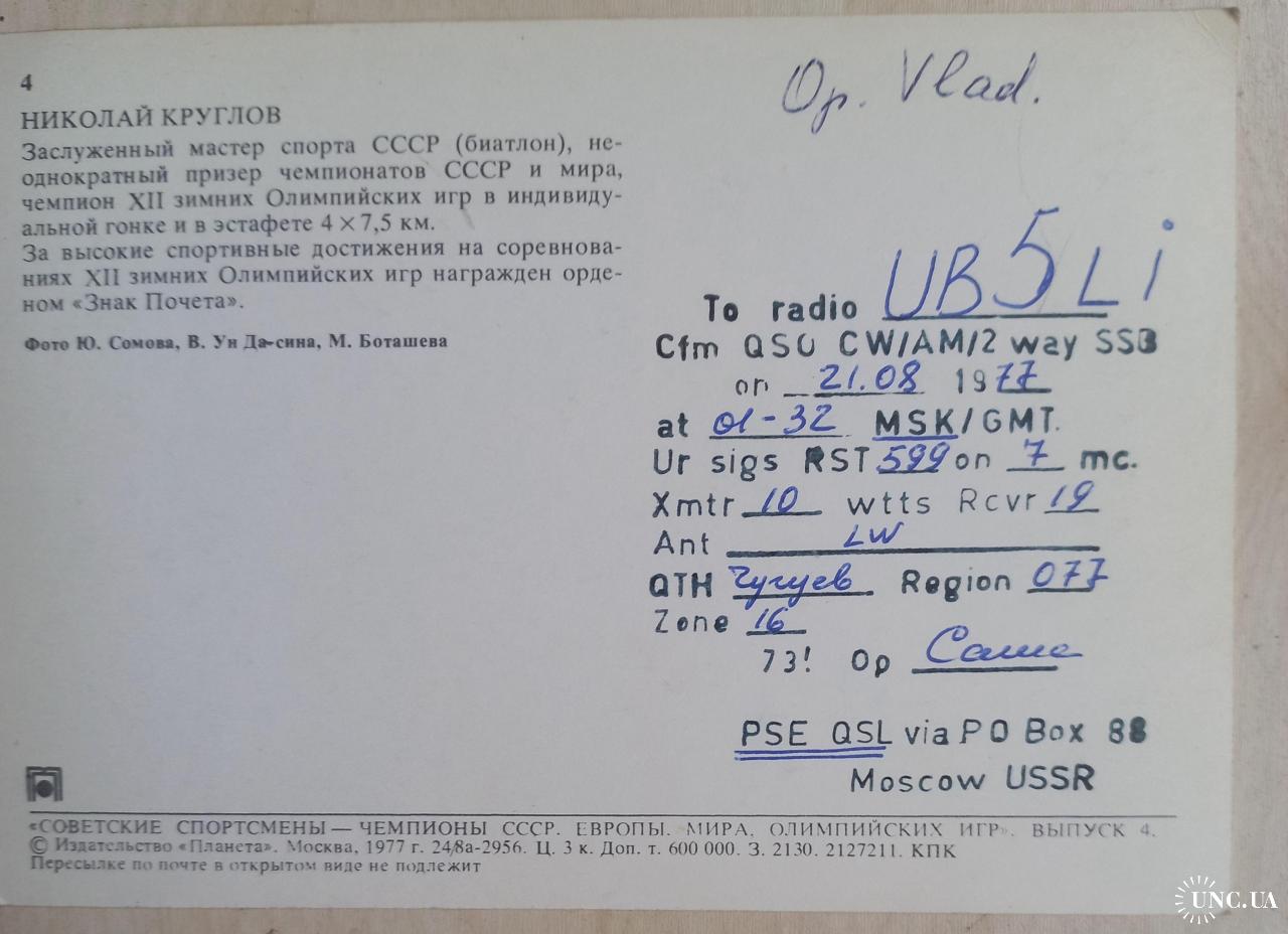1961-1980Николай Круглов. Чемпион XII зимних Олимпийских игр. Фото Ю. Сомова, Ун Да-сина, М. Боташева. «Советские спортсмены – чемпионы СССР. Европы. Мира. Олимпийских игр. Выпуск 4. Изд-во «Планета». Москва. 1977 г. Доп.тир. 600 000. На лицевой стороне стоит штамп позывного сигнала оператора. На обратной стороне – технические данные радио-обмена. Карточка без дефектов.
