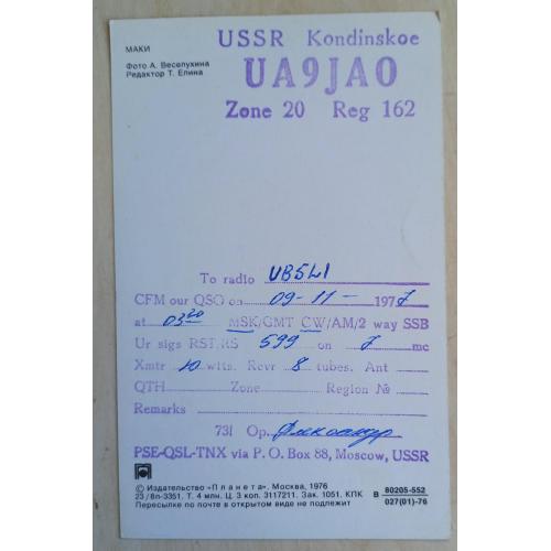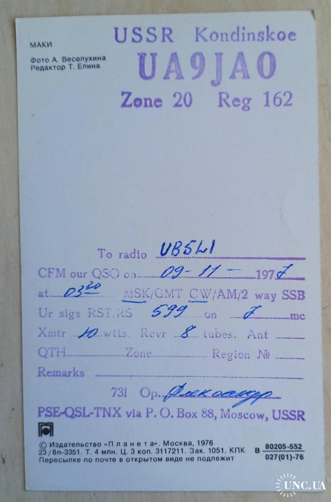 1961-1980Изд-во «Планета». Москва.1976. Т. 4 млн. Обратная сторона заполнена как QSL-карточка. Карточка без дефектов.