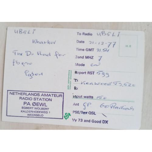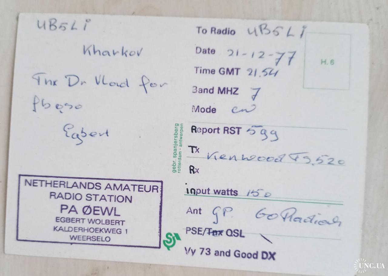 1961-1980Ламинированная видовая открытка. Издана «Братья Шпаньерсберг, Роттердам-Антверпен». Заполнена как ралиолюбительская QSL-карточка с позывным-сигналом голландца и данными радиообмена в эфире.Карточка без дефектов. Состояние отличное.