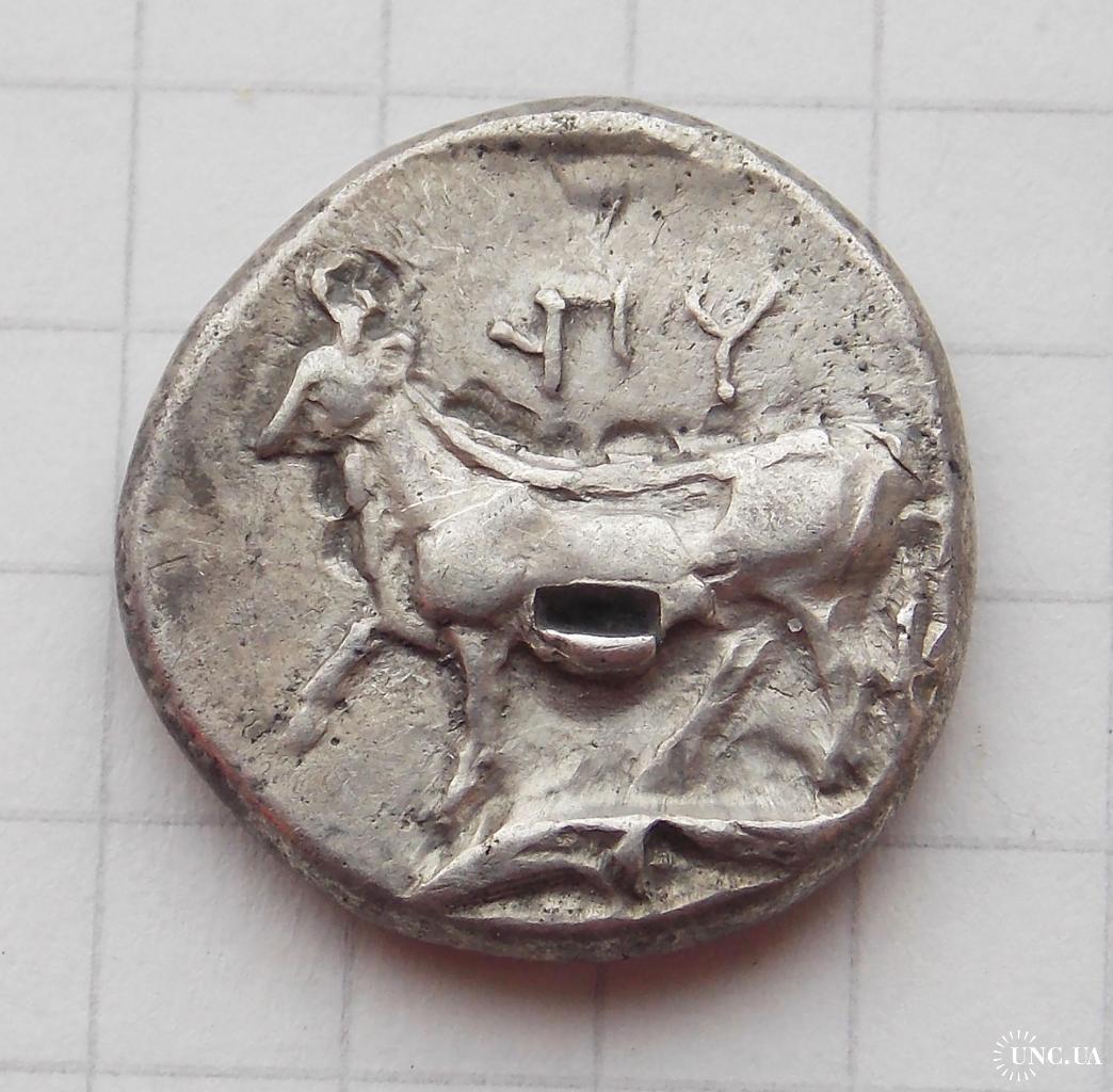 Аверс: ΠY, Телиця з піднятою передньою лівою ногою, що стоїть ліворуч на дельфіні, що пливе ліворуч;