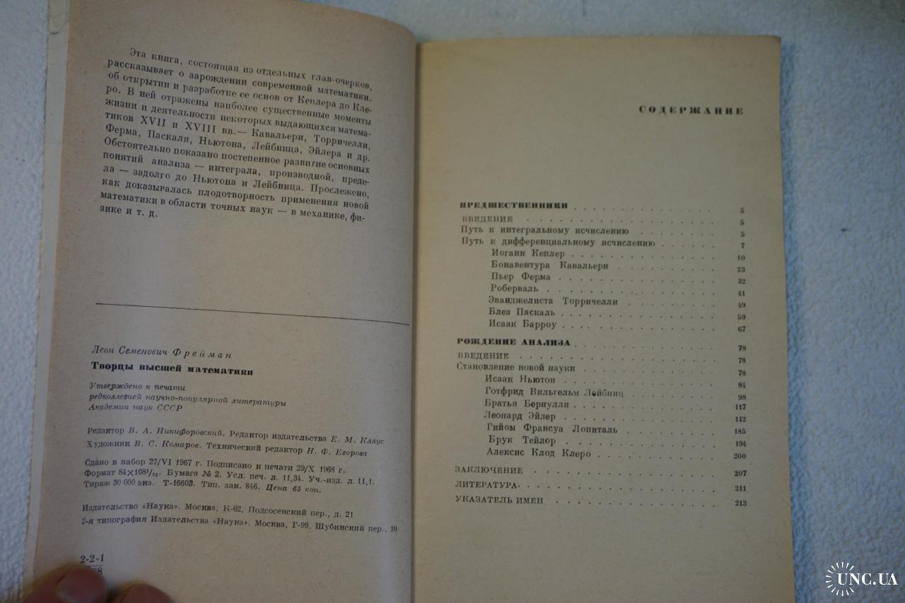 Книга состоит из отдельных глав-очерков, рассказывает о зарождении современной математики, об открытии и разработке ее основ от Кеплера до Клеро. В ней отражены наиболее существенные моменты жизни и деятельности некоторых выдающихся математиков XVII и XVIII вв. - Кавальери, Торричелли, Ферма, Паскаля, Ньютона, Лейбница, Эйлера и др. Обстоятельно показано постепенное развитие основных понятий анализа - интеграла, производной, предела - задолго до Ньютона и Лейбница. Показано, как доказывалась плодотворность применения новой математики в области точных наук - в механике, физике и т.д. Библиография: 41 назв.