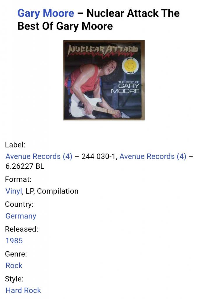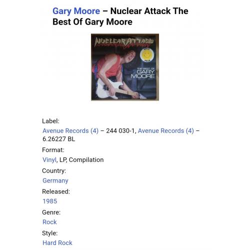 Вінілова платівка. Офіційна збірка найкращих хітів, Ірландсько-Британського блюз-рок, хард-рок виконавця, покійного вже Роберта Вільяма Гері Мура (Nuclear Attack The Best Of Gary Moore) 1973-85. Випуск фірми (Avenue Records) Germany, 1985-ий рік. Оригінальне, першопресове, Німецьке видання. Стан платівки NM-. Конверт глянцевий. Стан конверту EX+. Відправка по Україні службами доставки: Нова Пошта, Укр Пошта, Делівері. Також відправляємо посилки за кордон по цілому світу.