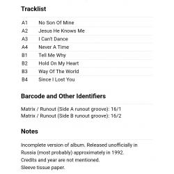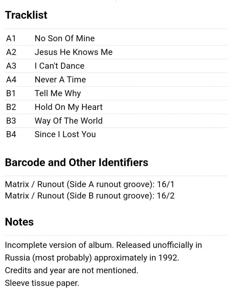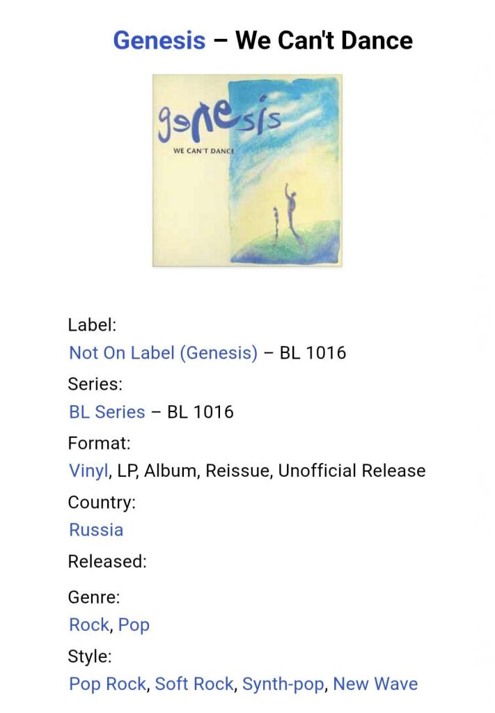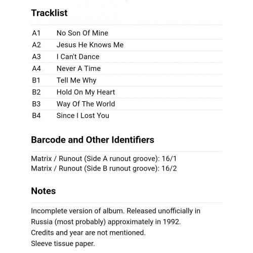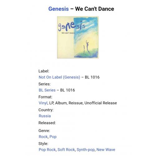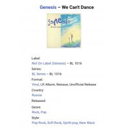 Вінілова платівка. П,ятнадцятий, в дискографії, студійний альбом, Британської прог-рок групи Genesis, основними учасниками якої були Філ Коллінз, Тоні Бенкс та Майк Резерфорд (We Can't Dance) 1991. Неофіційне видання (Unofficial Release). Випущено невідомою фірмою в 1993-му році. Стан платівки ЕХ+ Конверт ламінований. Стан конверту ЕХ+. Відправка по Україні службами доставки: Нова Пошта, Укр Пошта, Делівері. Також відправляємо посилки за кордон по цілому світу.