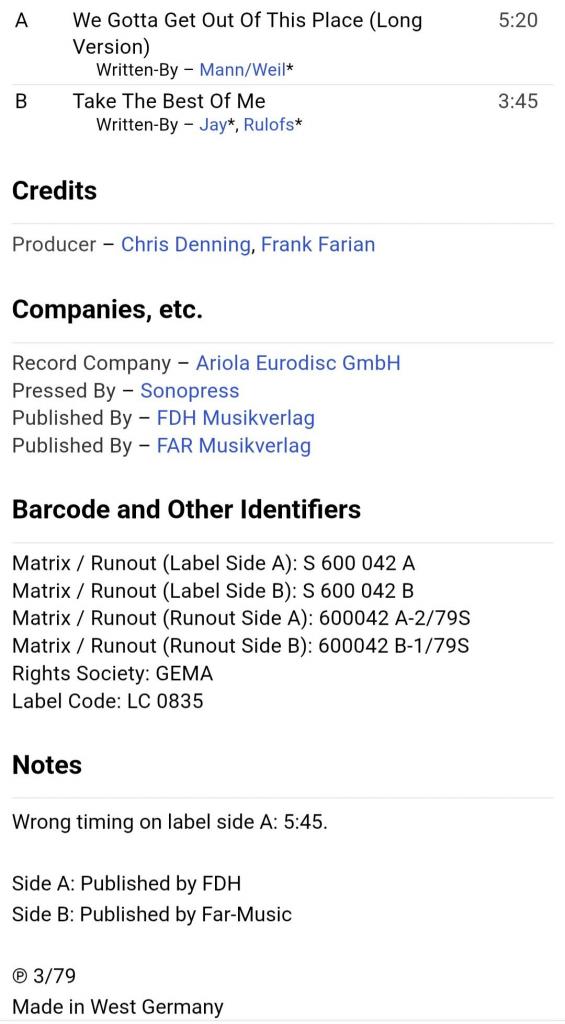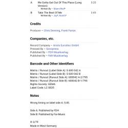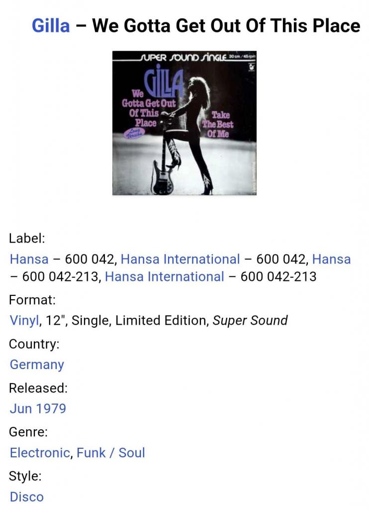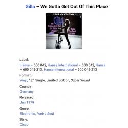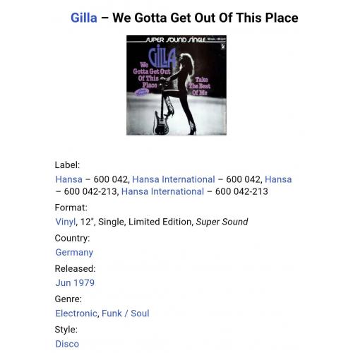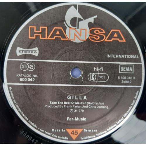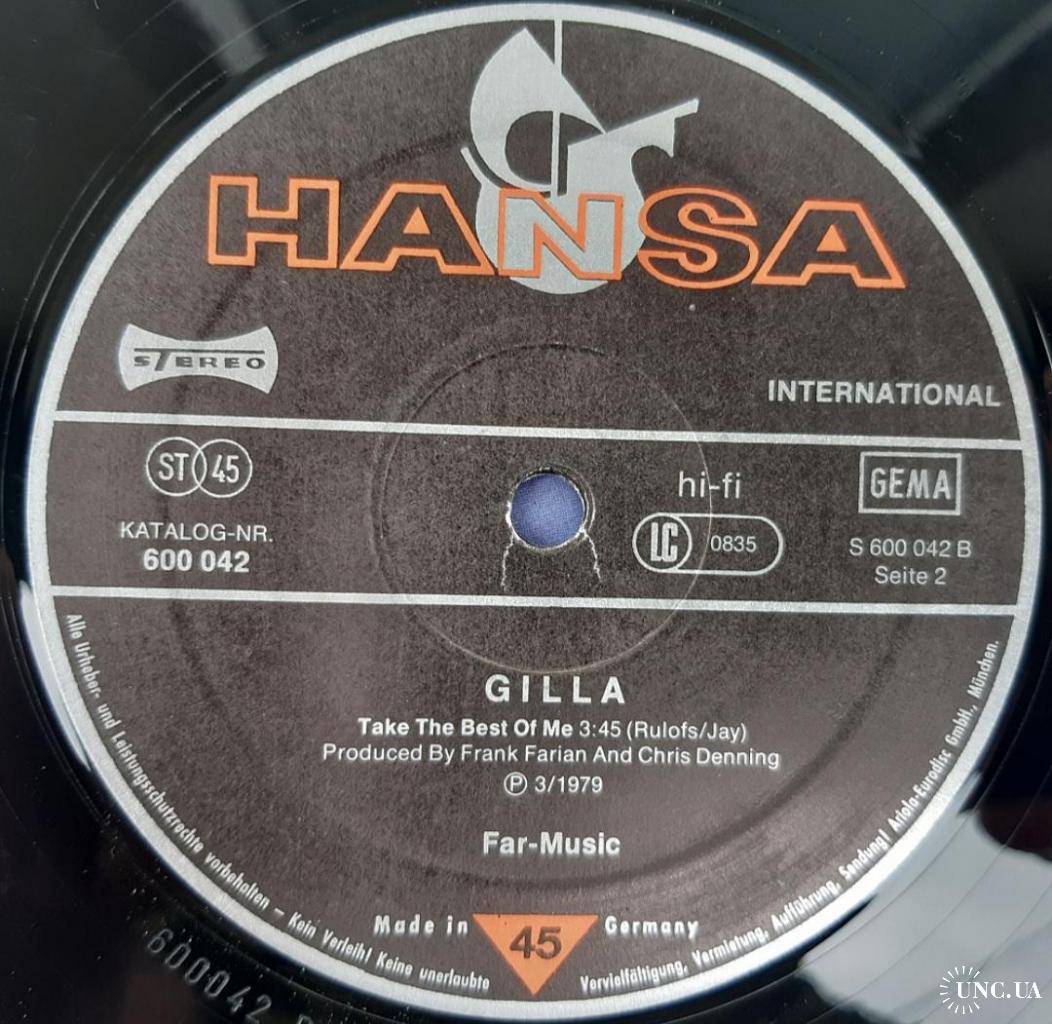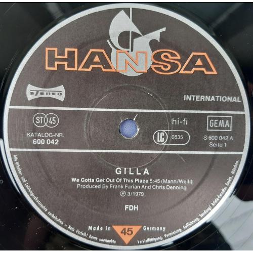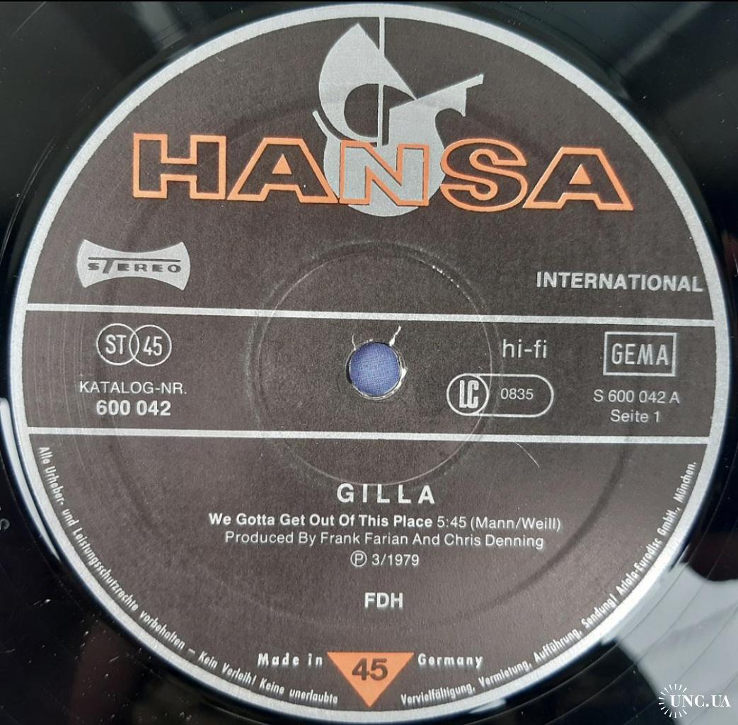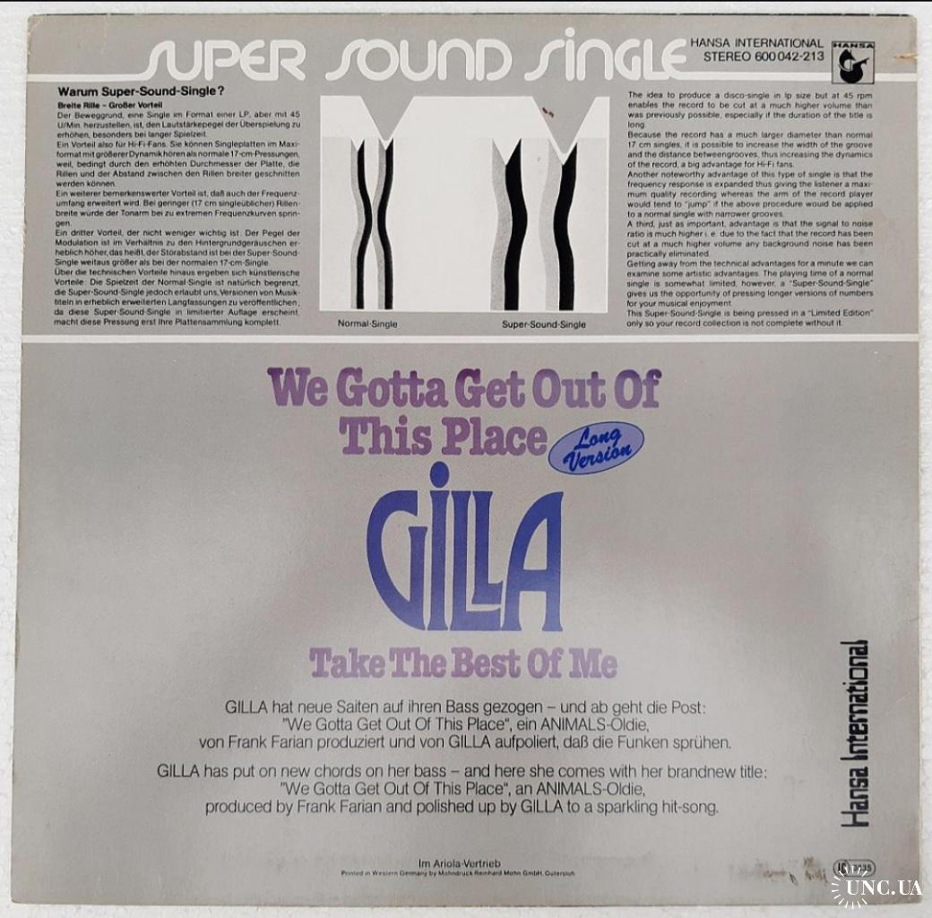 Вінілова платівка. Тринадцятий, в дискографії, студійний максі сингл (ЕР 12), Австрійської виконавиці стилю диско, фанк, соул, Гізелі Вухінгер, більше відомої під сценічним ім,ям Джилла / Гілла (We Gotta Get Out Of This Place / Take The Best Of Me) 1979. Випуск фірми (Hansa International) Germany, 1979-ий рік. Оригінальне, першопресове, Німецьке видання. Стан платівки VG+. Стан конверту ЕХ+. В комплекті внутрішня рекламна вставка від фірми Hansa. Відправка по Україні службами доставки: Нова Пошта, Укр Пошта, Делівері. Також відправляємо посилки за кордон по цілому світу.