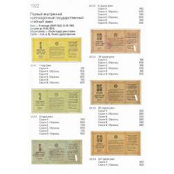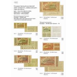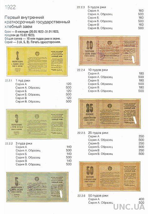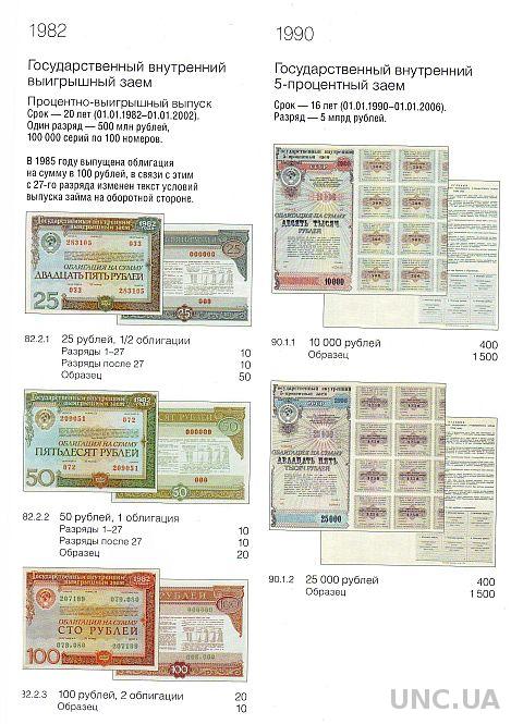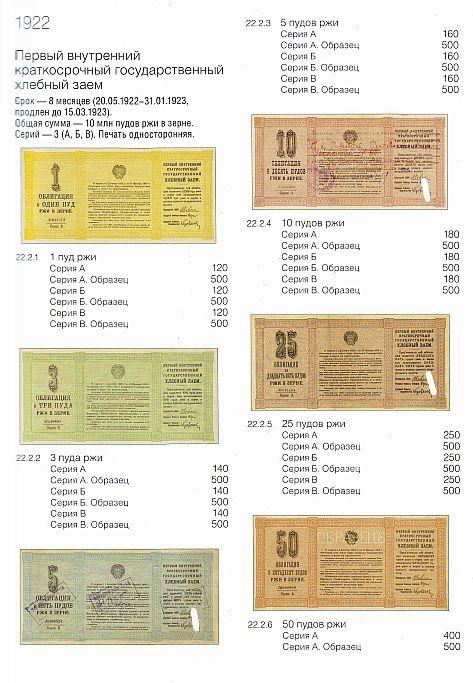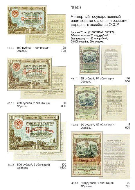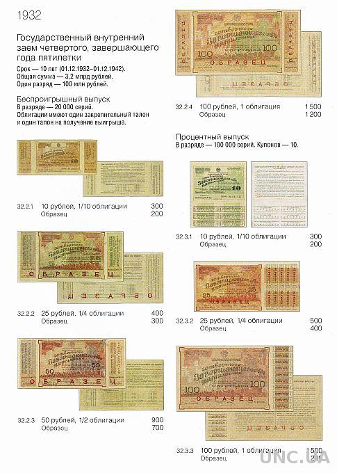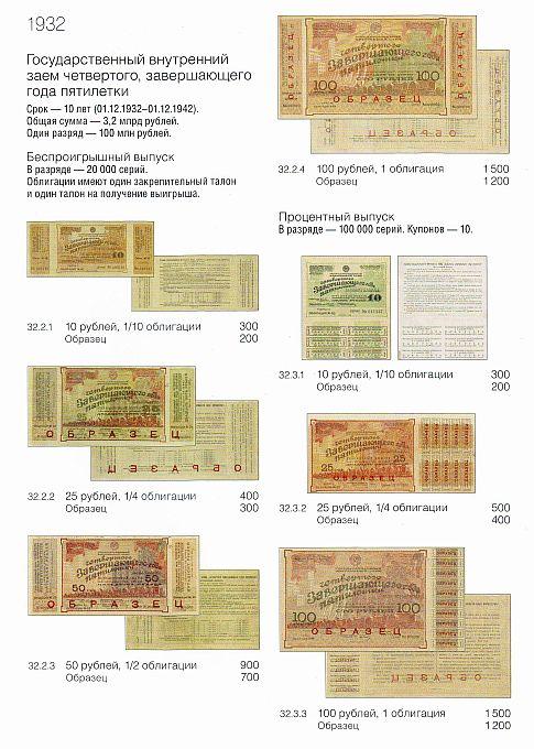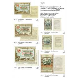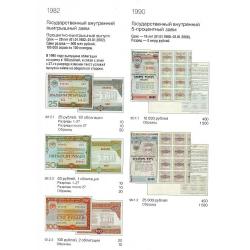Названия выпусков приведены в соответствии с их написанием на самой ценной бумаге. Указаны общие данные о выпуске — сроки погашения, суммы, количество разрядов, серий и купонов. Под изображением бумаги приведены каталожный номер, номинал и ориентировочная стоимость.