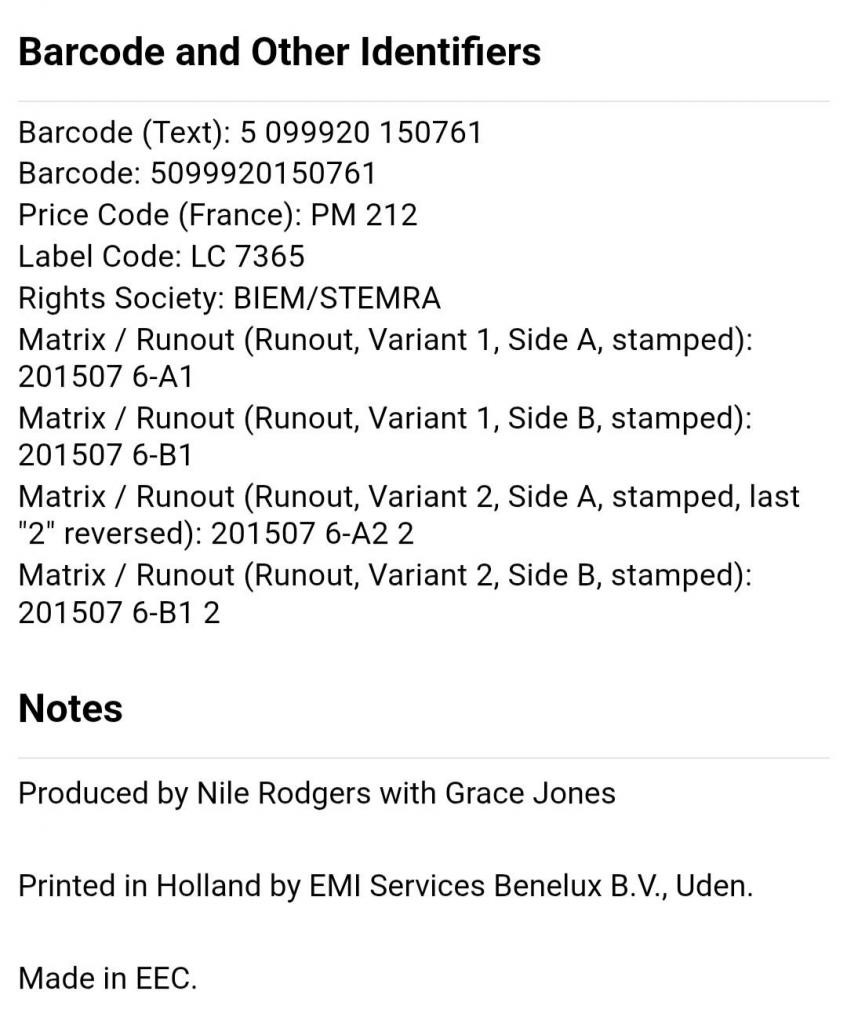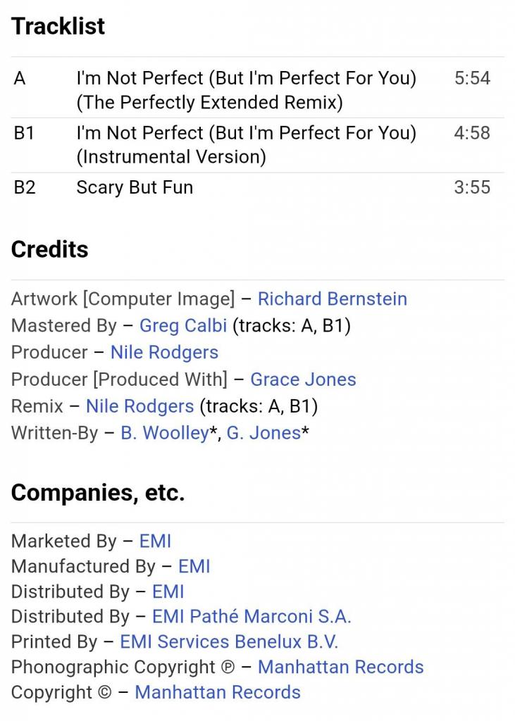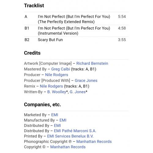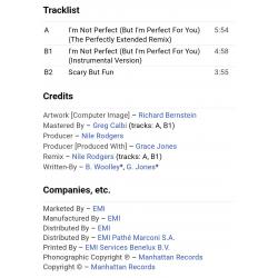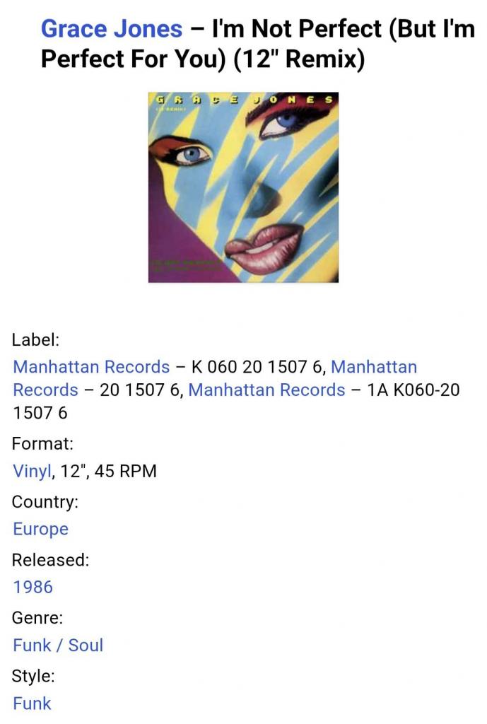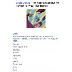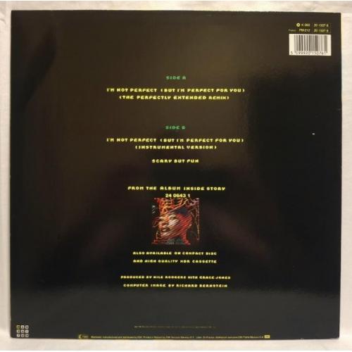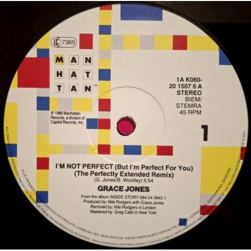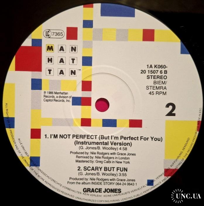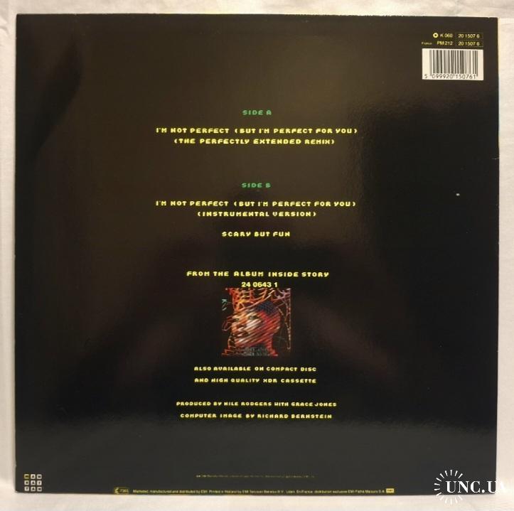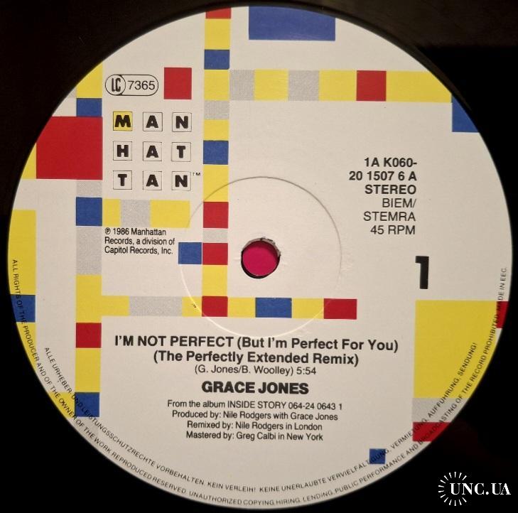 Вінілова платівка. Тридцять восьмий, в дискографії, студійний максі сингл (ЕР 12), Американської (родом з Ямайки) моделі, кіноактриси і музичної виконавиці стилів фанк, диско, ритм енд блюз, реггі, поп, Грейс Мендози Джонс (I'm Not Perfect. Bit I'm Perfect For You. 12 Remix) 1986. Випуск фірми (Manhattan Records) Europe, 1986-ий рік. Оригінальне, першопресове, Європейське видання. Стан платівки ЕХ+. Конверт глянцевий. Стан конверту EX+. Відправка по Україні службами доставки: Нова Пошта, Укр Пошта, Делівері. Також відправляємо посилки за кордон по цілому світу.