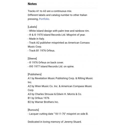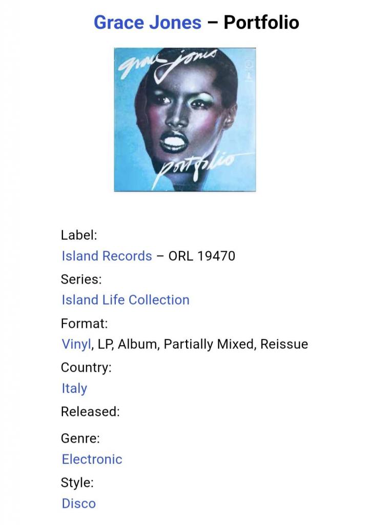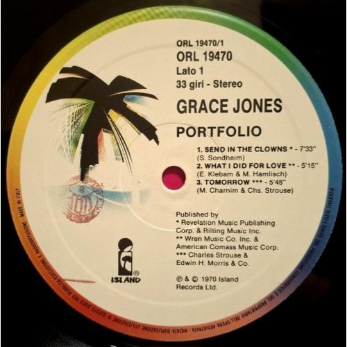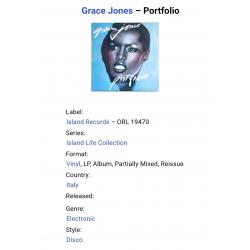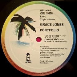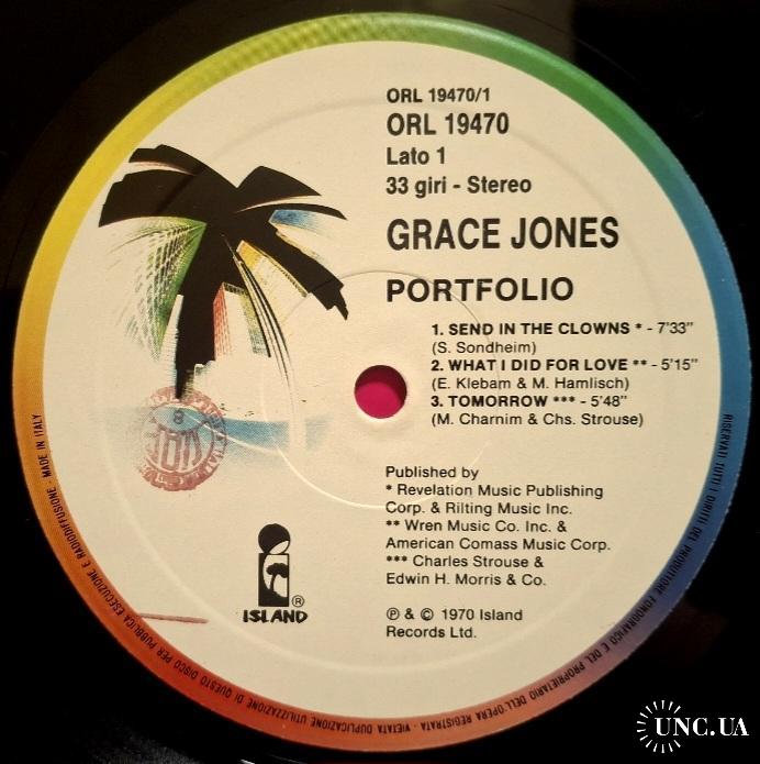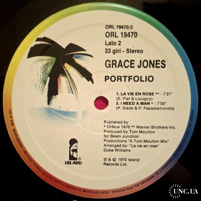 Вінілова платівка. Перший, дебютний, в дискографії, студійний альбом, Американської (родом з Ямайки) моделі, кіноактриси і музичної виконавиці стилів фанк, диско, ритм енд блюз, реггі, поп, Грейс Мендози Джонс (Portfolii) 1977. Випуск фірми (Island Records) Italy, 1977-ий рік. Оригінальне Італійське видання. Стан платівки ЕХ. Конверт глянцевий. Стан конверту EX+. Відправка по Україні службами доставки: Нова Пошта, Укр Пошта, Делівері. Також відправляємо посилки за кордон по цілому світу.