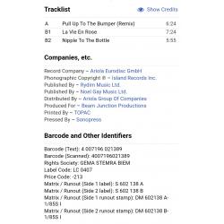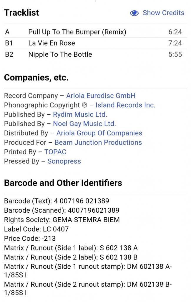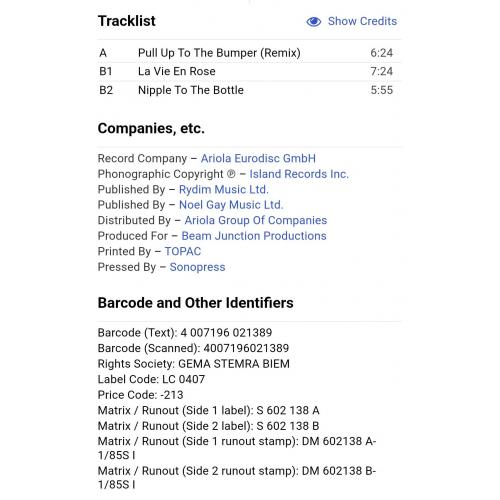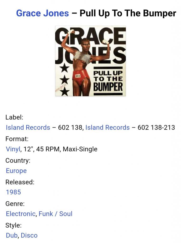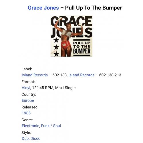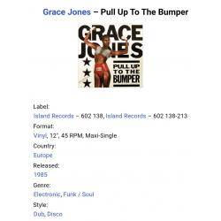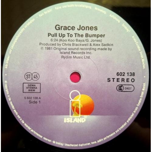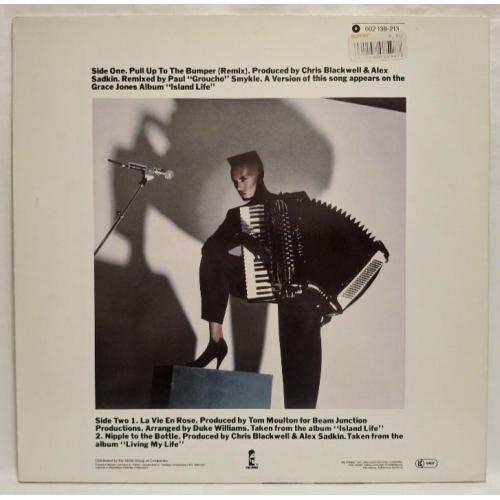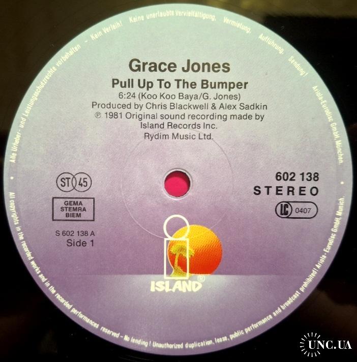 Вінілова платівка. Тридцять п'ятий, в дискографії, студійний максі сингл (ЕР 12), Американської (родом з Ямайки) моделі, кіноактриси і музичної виконавиці стилів фанк, диско, ритм енд блюз, реггі, поп, Грейс Мендози Джонс (Pull Up To The Bumper) 1985. Випуск фірми (Island Records) Europe, 1985-ий рік. Оригінальне, першопресове, Європейське видання. Стан платівки ЕХ+. Конверт глянцевий. Стан конверту EX+. Відправка по Україні службами доставки: Нова Пошта, Укр Пошта, Делівері. Також відправляємо посилки за кордон по цілому світу.
