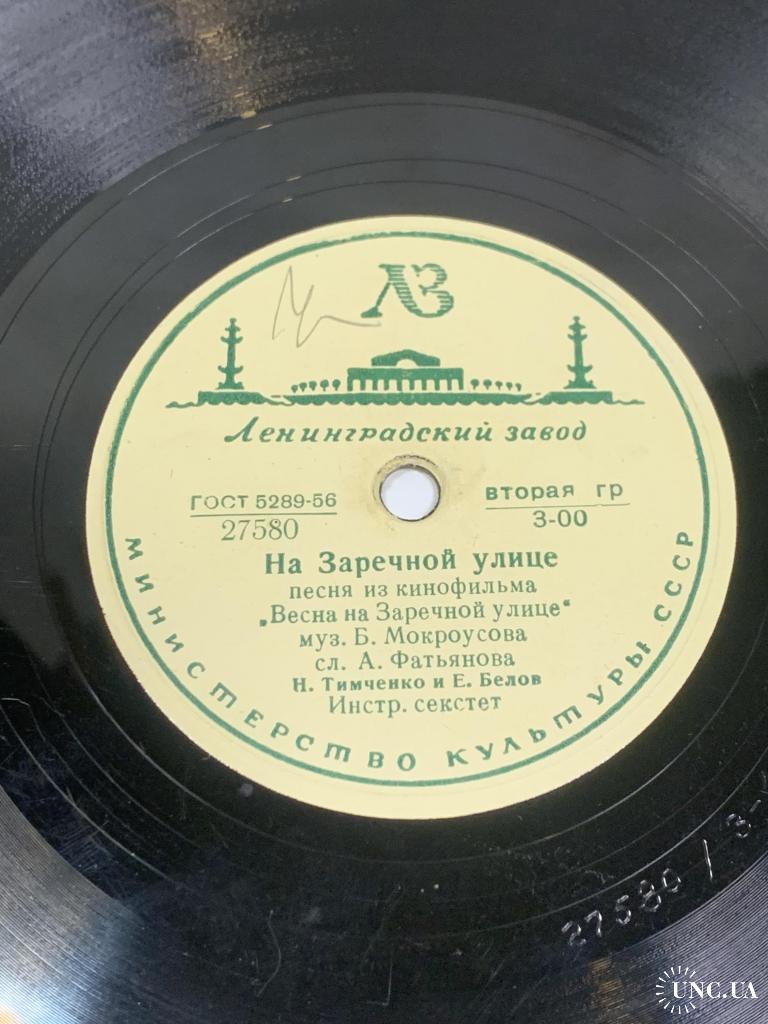 На одной стороне записана знаменитая песня «На Заречной улице» из фильма Весна на Заречной улице (музыка Б. Мокроусова, слова А. Фатьянова) в исполнении Н. Тимченко и Е. Белова в сопровождении инструментального секстета. Эта композиция стала символом эпохи и до сих пор вызывает ностальгию у слушателей.
