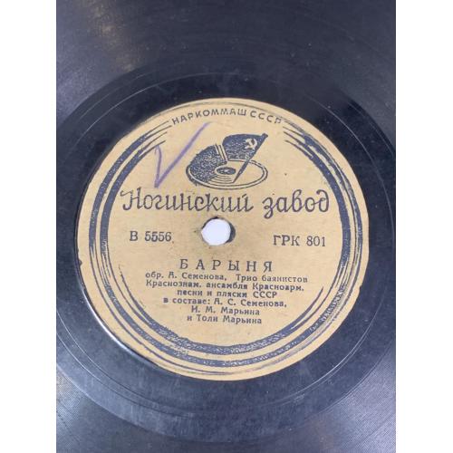 Старинная советская грампластинка довиниловой эпохи, выпущенная Ленинградским заводом в 1950-х годах. Запись выполнена на шеллаке и предназначена для воспроизведения на патефонах со скоростью 78 оборотов в минуту. Пластинка представляет собой ценный коллекционный экземпляр, связанный с культовой советской киномузыкой.