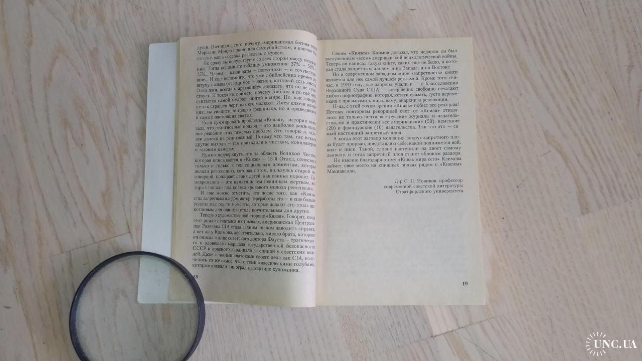 Хотя `Князь мира сего` - это только роман, но эта книга предназначена только для совершеннолетних. В судебно-медицинских книгах на эту тему обычно еще стоит предостережение: `Предназначается только для юстиции и медицины, для священников и педагогов, а также для лиц, занимающихся психологией и социологией`. Некоторые имена, персонажи и события в этой книге хотя и являются элементами романа, но списаны с жизни. Благодаря специфическим особенностям этой книги, требующей специальной исследовательской работы и авторских архивов, всю ответственность за содержание книги автор берет на себя.`Издатель заверяет, «Князь...» Климова - это запретный плод вдвойне. С одной стороны, это одна из самых сильных и ярких антисоветских книг. С другой стороны, «Князя» (даже в его первых, сравнительно невинных набросках) испугалась почти вся русская пресса на Западе... Уже одни похождения «Князя» в печати столь загадочны и пикантны, что читаются, как увлекательный роман». Об авторе сказано, что Григорий Петрович Климов (р. 1918) был в конце Отечественной войны направлен на учебу в Военно-дипломатическую академию. Окончив академию, работал в Берлине в Советской военной администрации. «А в 1947 г. он получил приказ о возвращении в сталинскую Москву, где, очевидно, его, сына ``врага народа``, ожидали лагеря ГУЛАГа... После тяжелых раздумий он вынужден был бежать в Западную зону Германии, где сразу же оказался в руках дегенератов из ЦРУ... И с 1949 по 1950 г. он работал в Гарвардском проекте по строго засекреченной теме ``Развал коммунистической системы`` под руководством сионского мудреца Натана Лейтеса по программе ЦРУ...»
