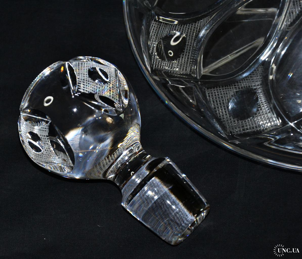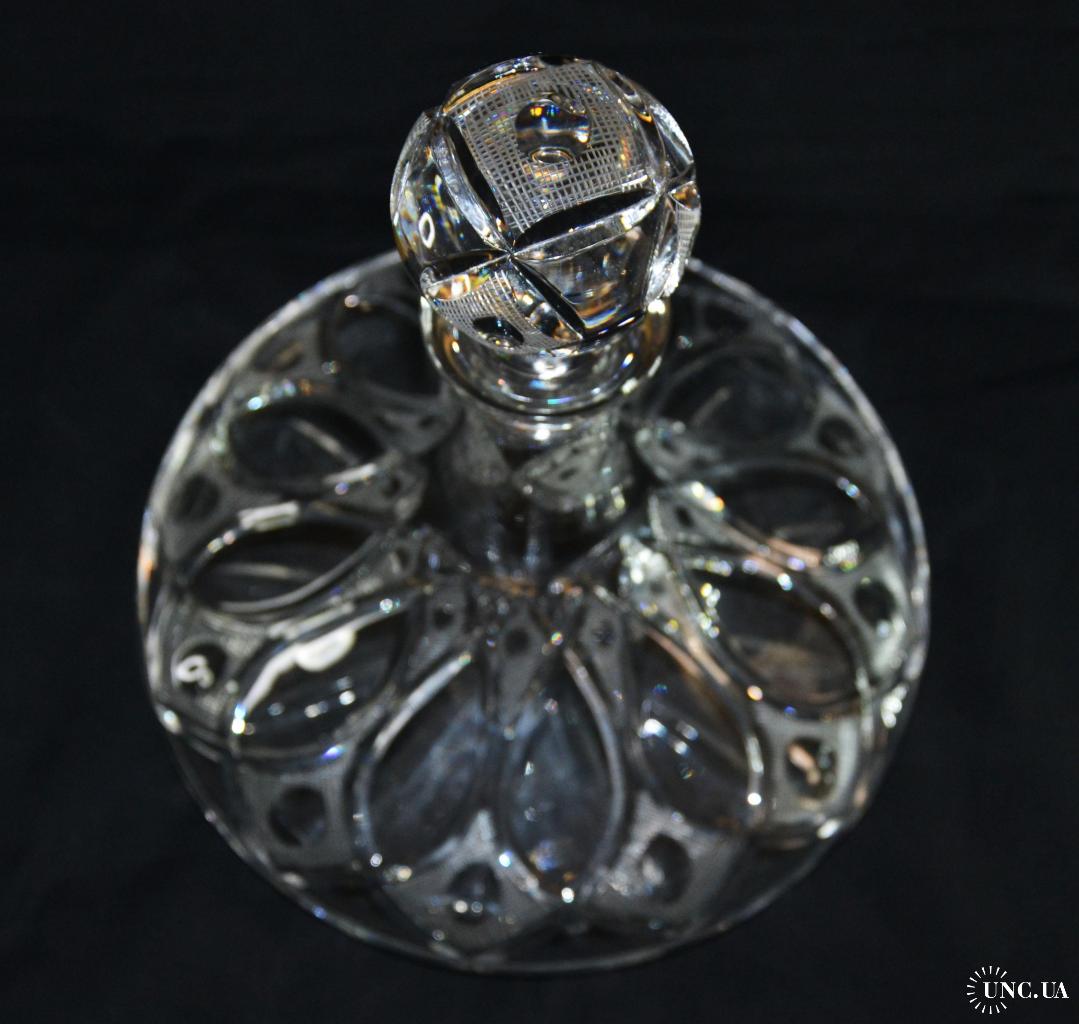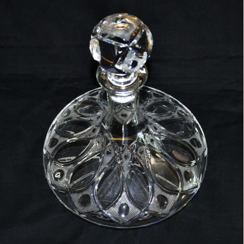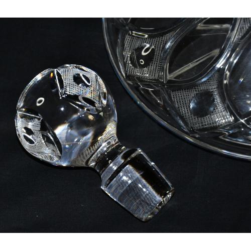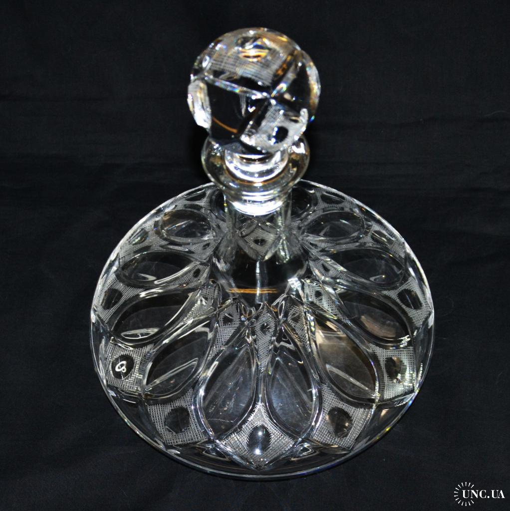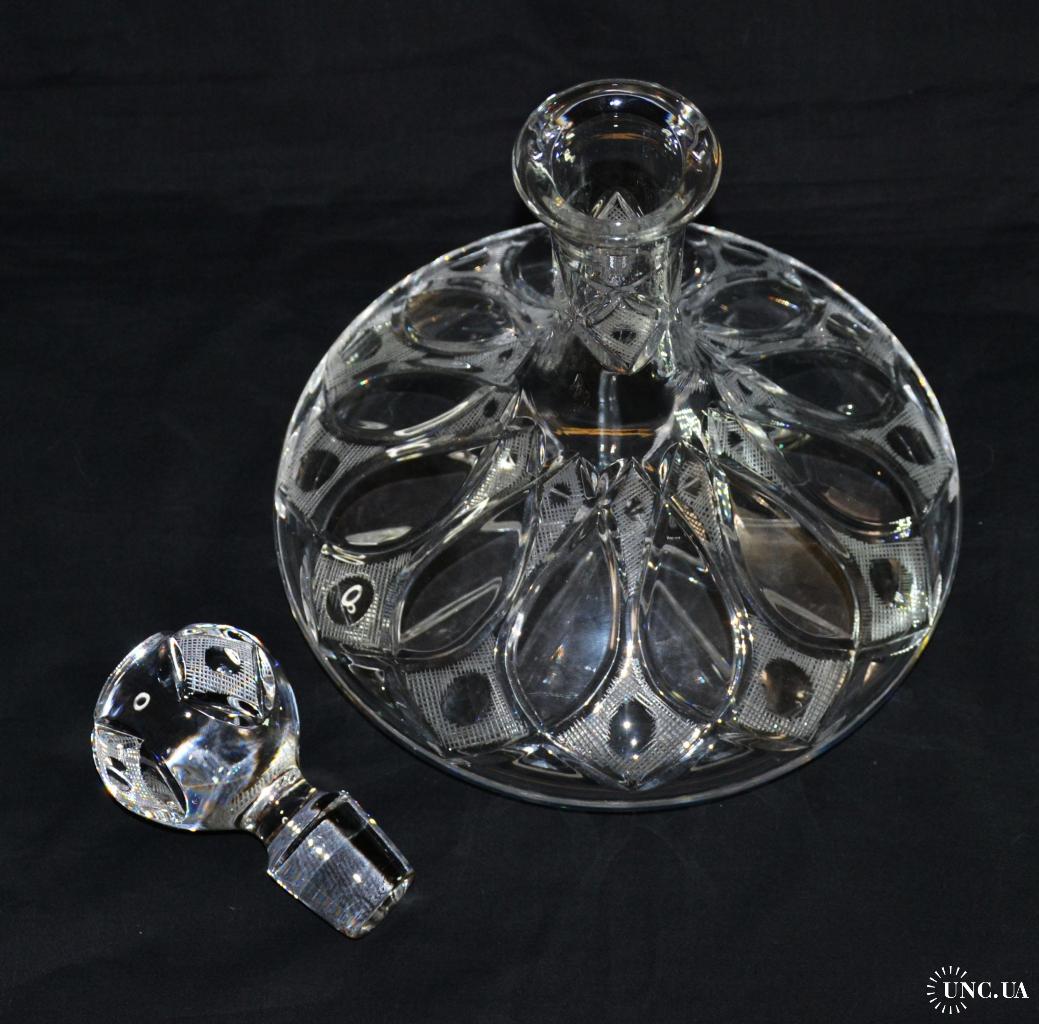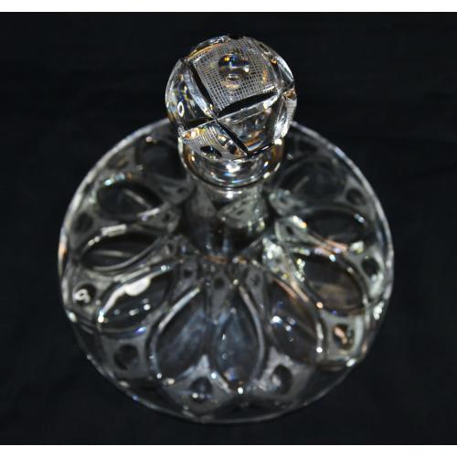 1941-1960Хрустальный графин для корабля, XX век, традиционной формы, с гранёным декором в виде расходящейся звезды на дне, увенчанный соответствующей сферической пробкой. Высота: 26 cм. Диаметр: 22cм.