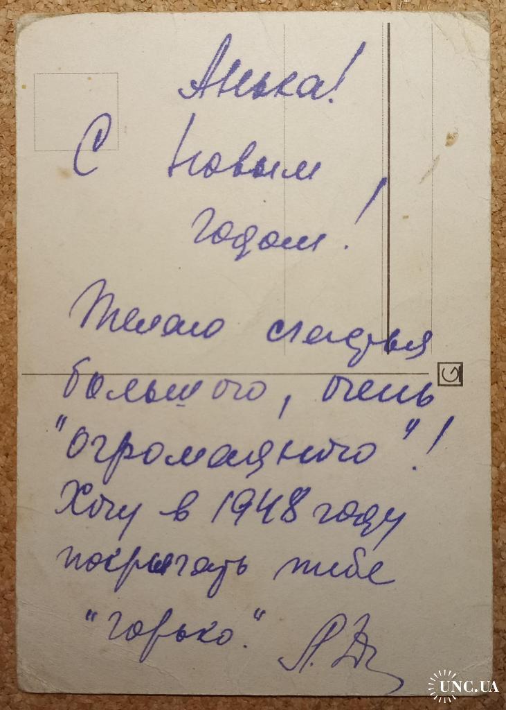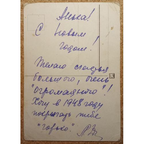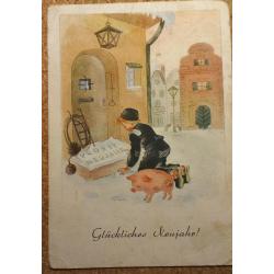 Трогательный сюжет. Мальчик-трубочист пишет пальцем на снежном крыльце «Ура Новый год!». Рядом – розовая свинка. Новогодняя идиллия. На обратной стороне не менее трогательный бодрый текст моей маме от однополчанки. Там же. в Австрии мама и папа поженились. Это память, волнующая сердце. Год издания открытки принят условно. Он определен по дате подписи в письменном тексте. На самой открытке дата издания отсутствует, поэтому есть основание полагать, что год выпуска открытки может быть более ранним. Следы времени. Состояние открытки хорошее.
