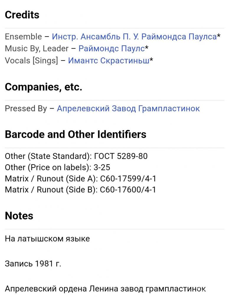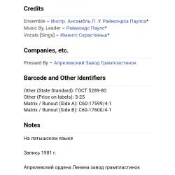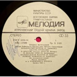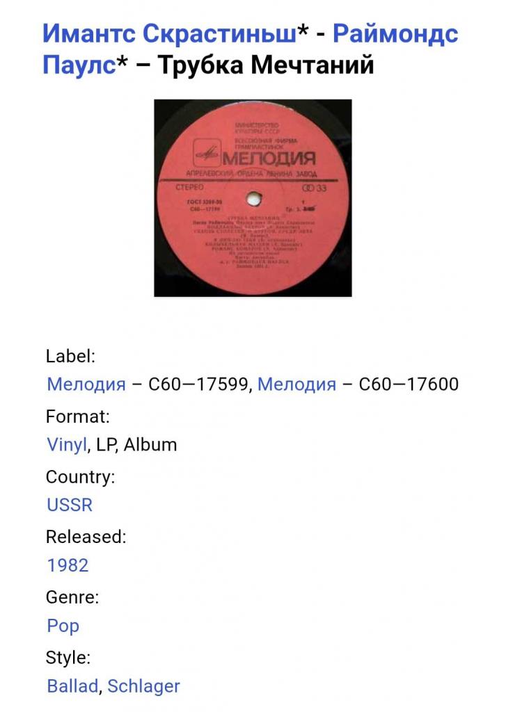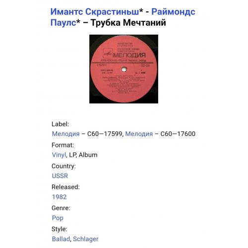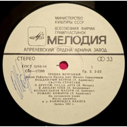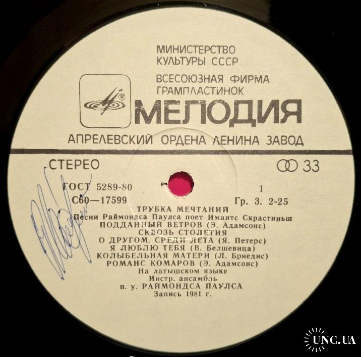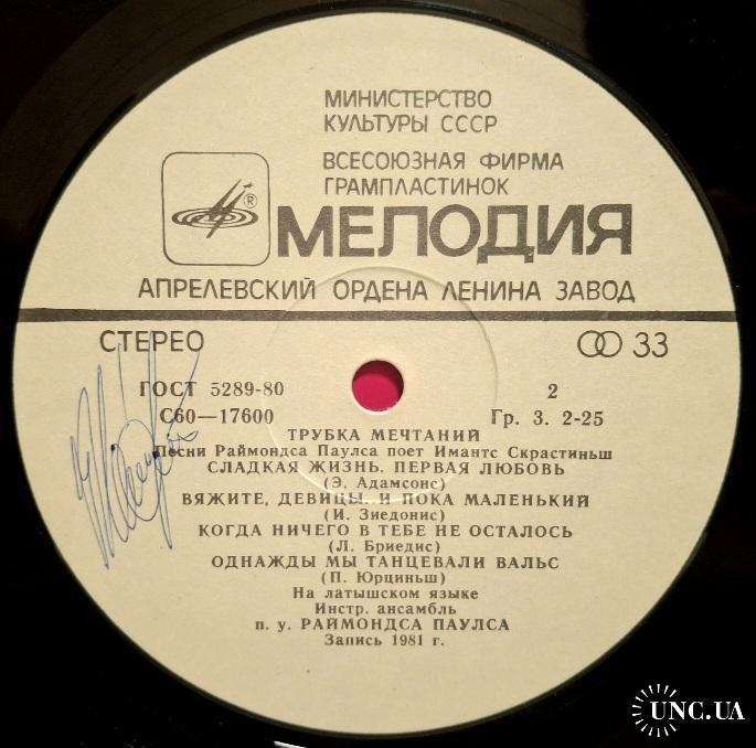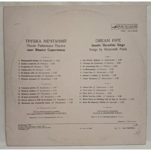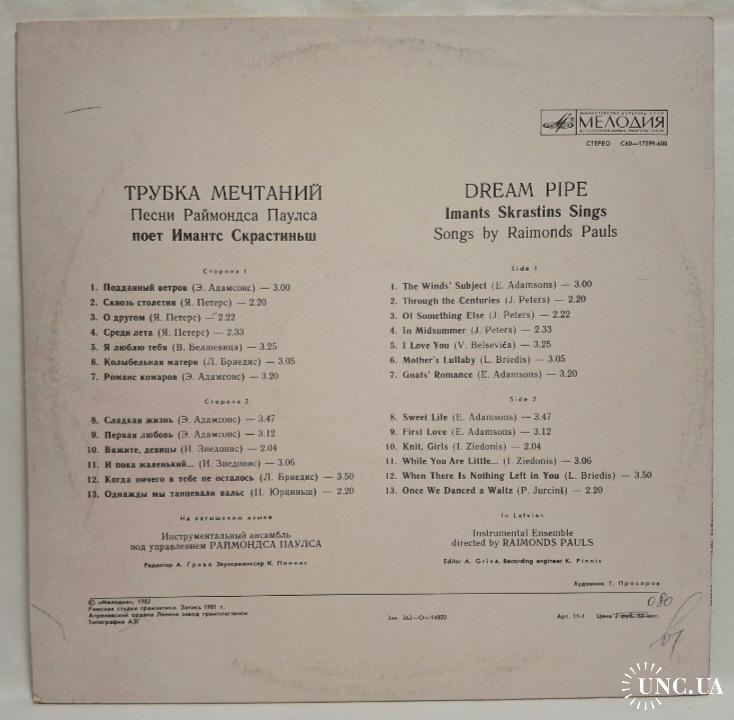 Вінілова платівка. Спілний, студійний музичний альбом Латвійського (радянського) виконавця, актора театру і кіно, народного артиста Латвійської РСР, володара титулу Кавалера Трьох Зірок, Імантса Скрастіниша та Латвійського (радянського) композитора, музиканта та піаніста, Почесного доктора Латвійської академії наук, кавалера королівського ордену Полярної Зірки першого ступеню Раймонда Паулса (Трубка Мечтаний) 1981. Випуск фірми (Мелодія) СРСР, Апрелєвський завод грамплатівок 1982-ий рік. Стан платівки NM-. Стан конверту EX+. Відправка по Україні службами доставки: Нова Пошта, Укр Пошта, Делівері. Також відправляємо посилки за кордон по цілому світу.