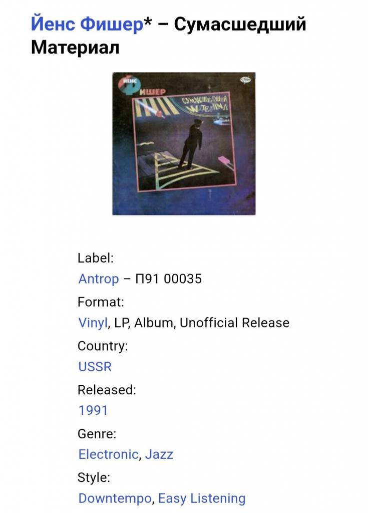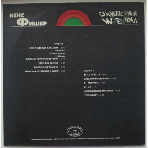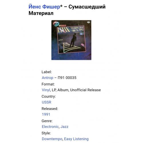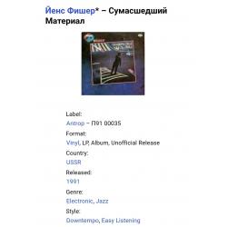 1981-2000Вінілова платівка. Перший, в дискографії, студійний, альбом Німецького музиканта стилю електронік-джаз, Jens Fischer (Mad Material) 1989. Випуск фірми (Antrop) Russia 1991-ий рік. Неофіційне видання (Unofficial Release). Стан платівки NM-. Стан конверту NM-. Відправка по Україні службами доставки: Нова Пошта, Укр Пошта, Делівері. Також відправляємо посилки за кордон по цілому світу.