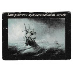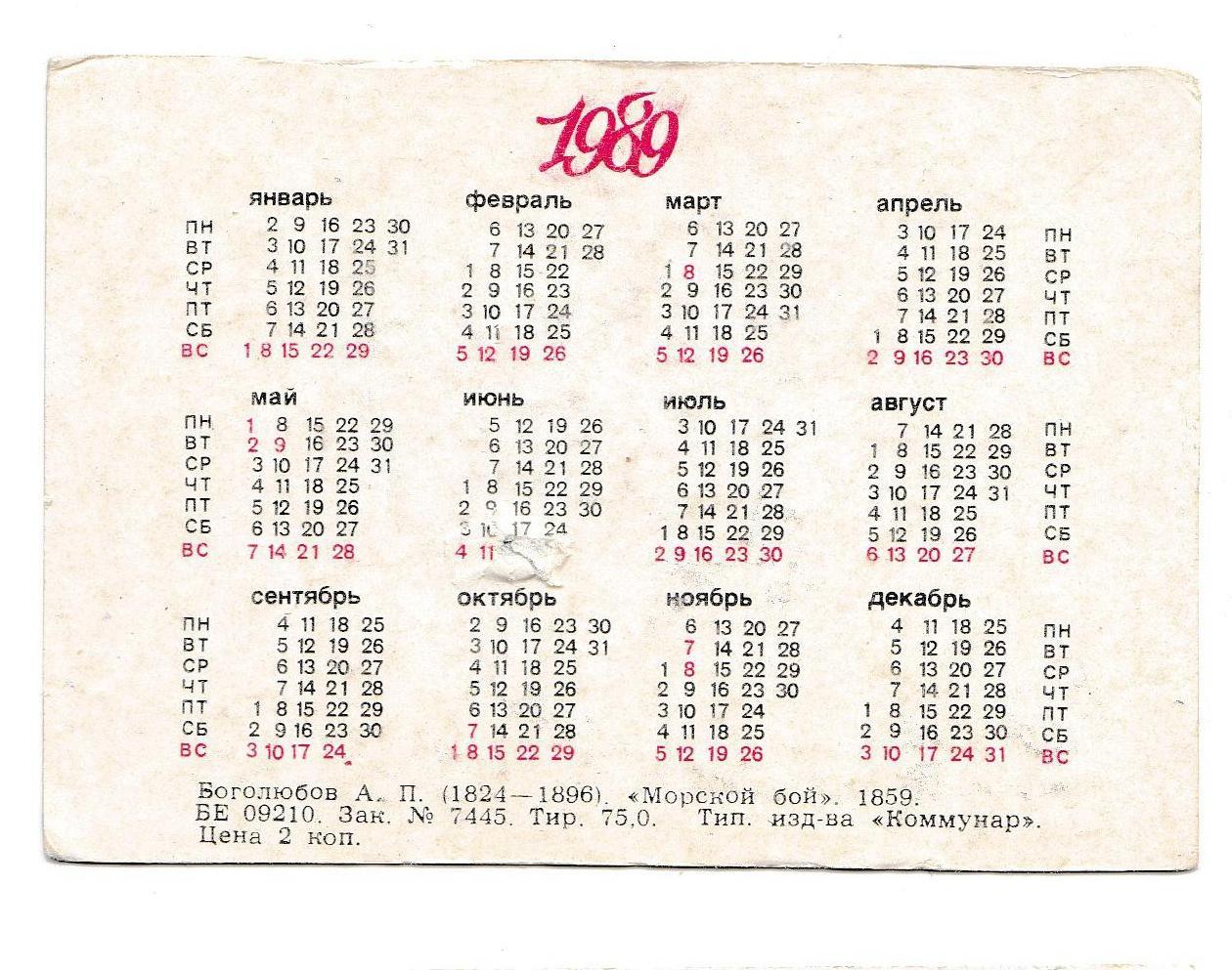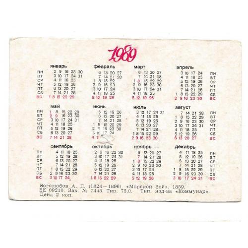 1981-2000Календарик 1989 Запорожский художественный музей, Боголюбов, Морской бой, корабль.
