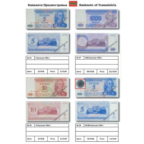 Каталог по банкнотам СССР, России, странам СНГ, Латвии, Литве и Эстонии. Рассмотрены также образцы банкнот и банкноты замещения. Актуальные цены в евро. Практически все каталогизированные боны проиллюстрированы цветными иллюстрациями.