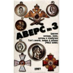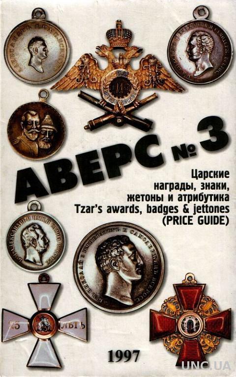 Каталог «Аверс №3. Царские награды, знаки, жетоны и атрибутика» - описывает царские награды, полковые и должностные знаки, настольные медали и жетоны. Всего более 1100 наименований. Автор подробно освещает все представленные разделы коллекционирования с указанием цен на предметы в долларах USA. Дополнительные 80 цветных вкладок подробно иллюстрируют царские ордена, медали, знаки, жетоны и т.д.