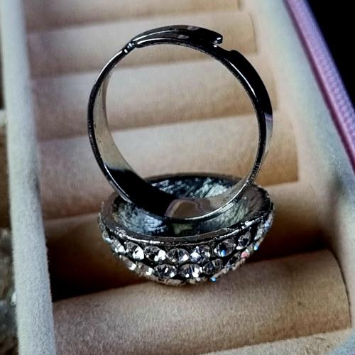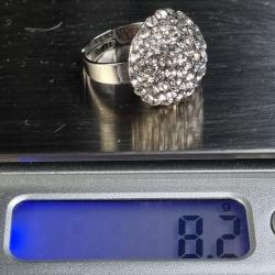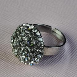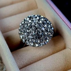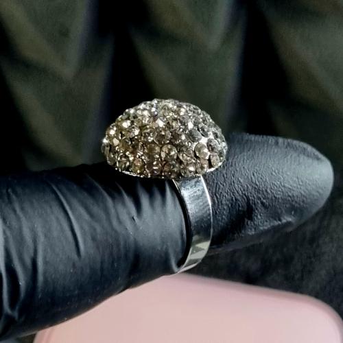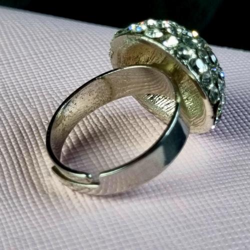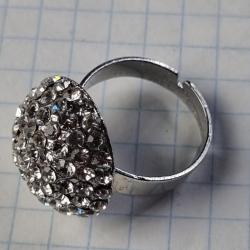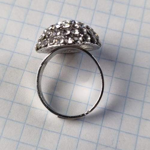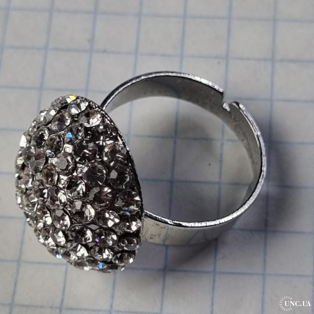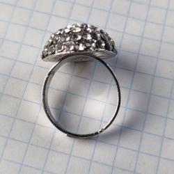 Яскраве кільце з куполоподібною верхівкою, інкрустоване блискучими камінцями. Металевий корпус, регульований розмір.