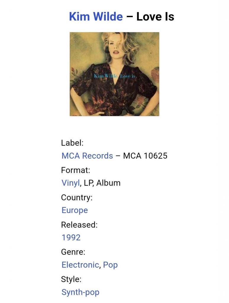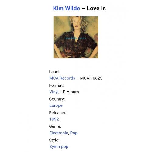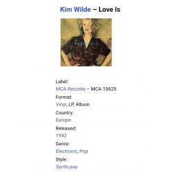 Вінілова платівка. Сьомий, в дискографії, студійний альбом Британської радіоведучої, кіноактриси і музичної виконавиці стилів сінті поп, нова хвиля, гай-енерджі, поп-рок, Кім Вайлд (Love Is...) 1992. Випуск фірми (MCA Records) Germany, 1992-ий рік. Оригінальне, першопресове Німецьке видання. Лімітований тираж (Limited Edition). Стан платівки ЕХ+. Конверт глянцевий. Стан конверту ЕХ+. В комплекті внутрішня вставка (Ois). Відправка по Україні службами доставки: Нова Пошта, Укр Пошта, Делівері. Також відправляємо посилки за кордон по цілому світу.