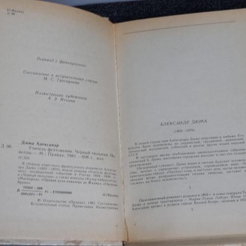 Опис: У збірник відомого французького романіста Олександра Дюма (1802-1870) увійшли романи «Вчитель фехтування», присвячений подіям в Росії 1824-1825 рр., і «Чорний тюльпан», а також новели «Кучер кабріолета», «Маскарад», «Права рука кавалера де Жмака», «Паскаль Бруно».