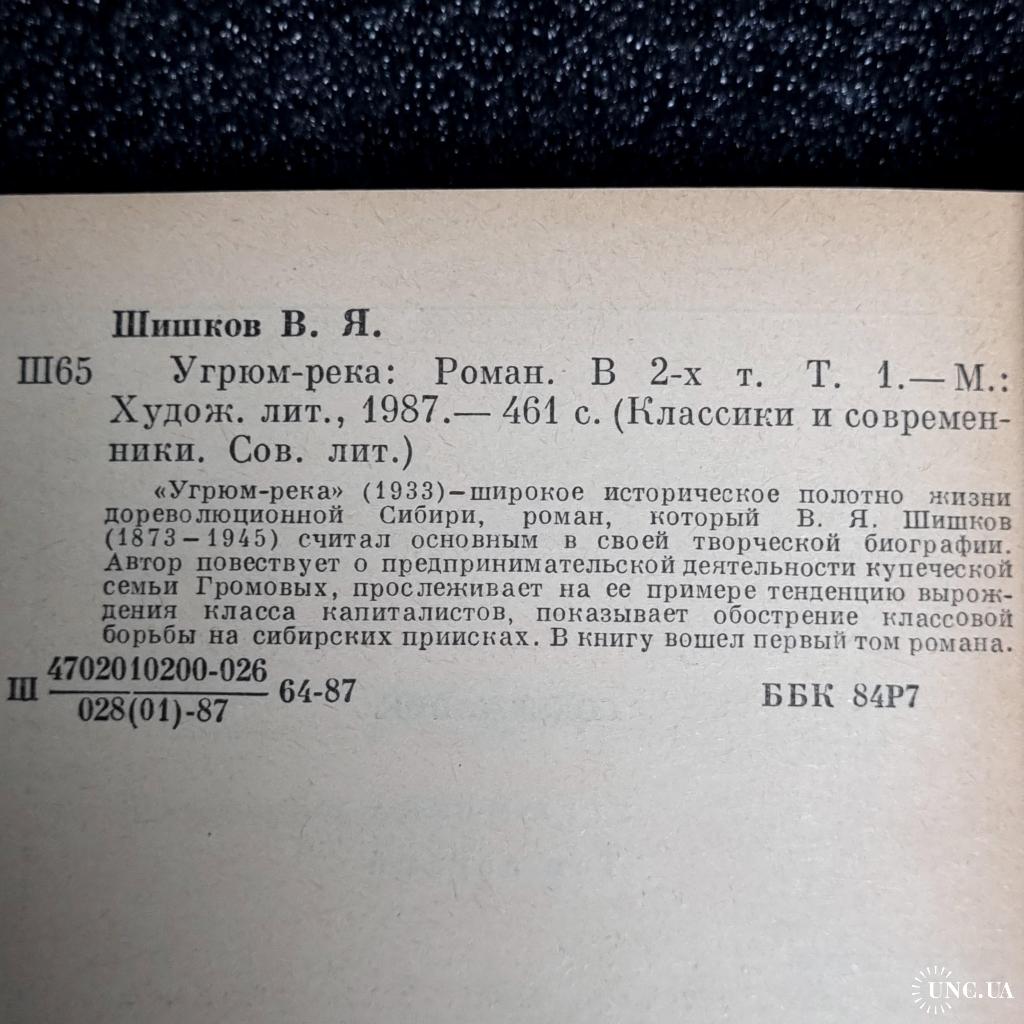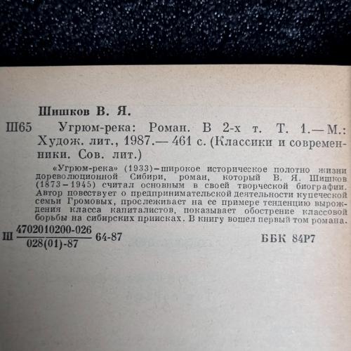 «Угрюм-ріка» (1933) — широке історичне полотно життя дореволюційного Сибіру, роман, який В. Я. Шишков (1873-1945) вважав основним у своїй творчій біографії. Автор оповідає про підприємницьку діяльність купецької родини Громових, простежує на її прикладі тенденцію виродження класу капіталістів, показує загострення класової боротьби на сибірських копальнях. До книги увійшов перший том роману.