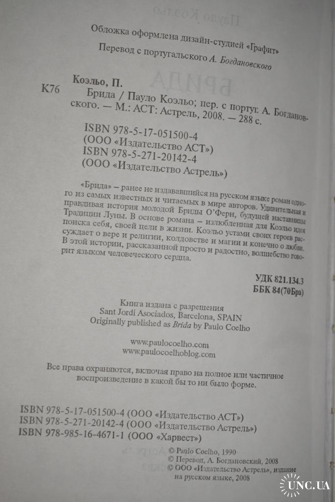 Брида - ранее не издававшийся на русском языке роман одного из самых известных и читаемых в мире авторов, волнующая история о любви, страсти, тайне и духовном поиске. Удивительная и правдивая история молодой ирландки Бриды, стремящейся познать мир. На ее представление о жизни повлияют два человека, которых она повстречает на своем пути. Оба видят в Бриде особый дар, но раскрыть его в себе она должна без их участия. В основе романа - излюбленная для Коэльо идея поиска себя, своей цели и жизни. Коэльо устами своей героини рассуждает о вере и религии, колдовстве и магии и, конечно, о любви. В этой истории, рассказанной просто и радостно, волшебство говорит языком человеческого сердца.