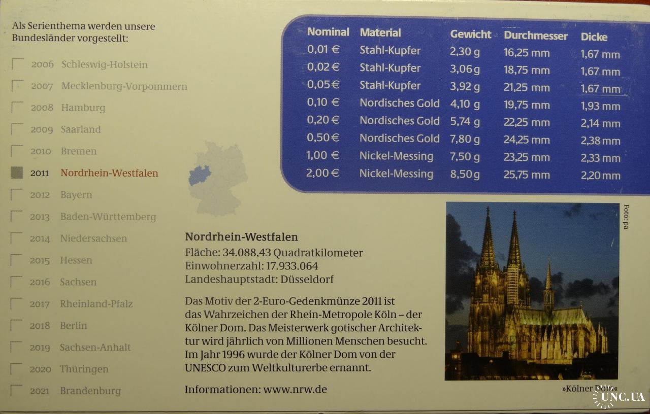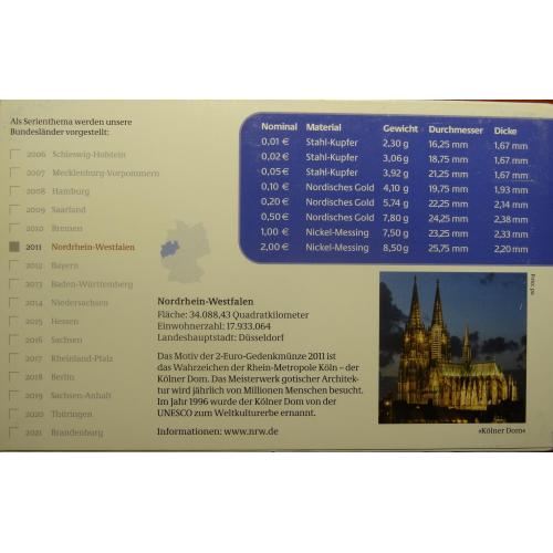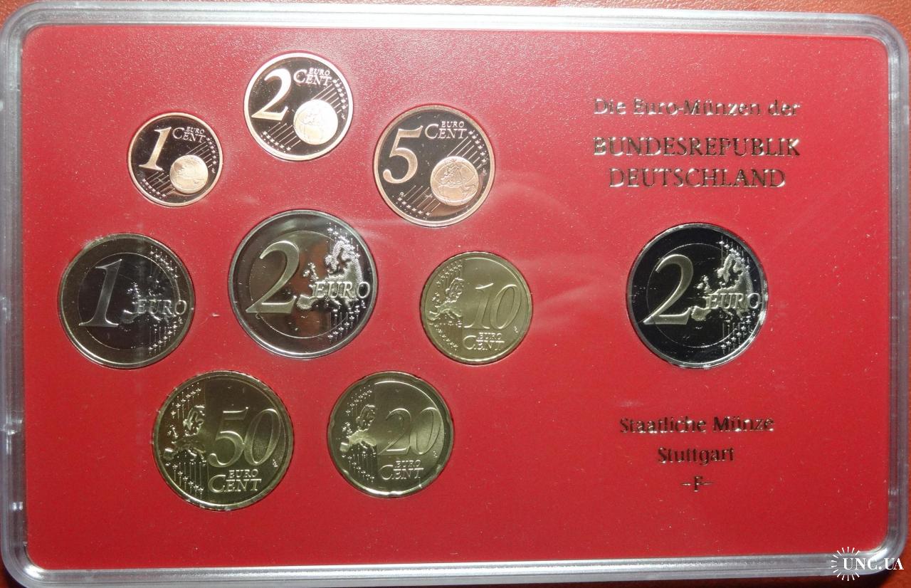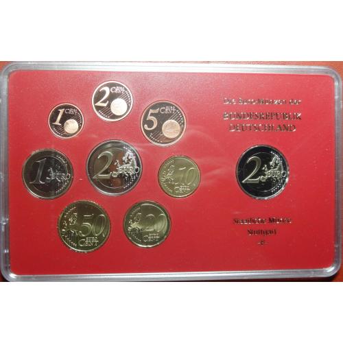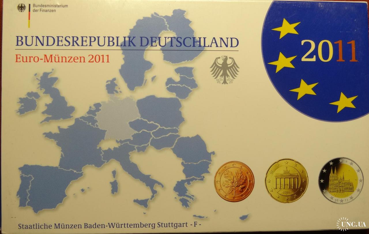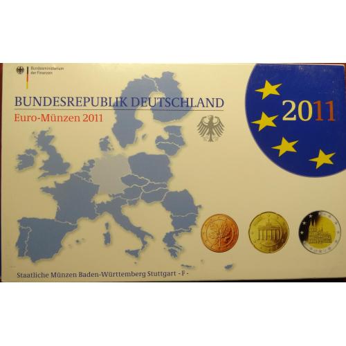 Complete euro-set of Germany 2011 F + 2 euro Kolner Dom (Stuttgart mint) UNC / Повний комплект обігових євромонет Німеччини 2011 F + ювілейна монета 2 євро (монетний двір Штутгарт) UNC