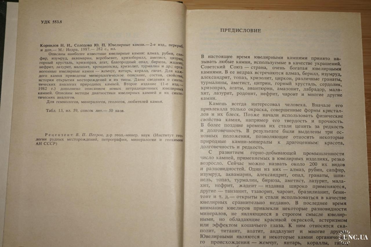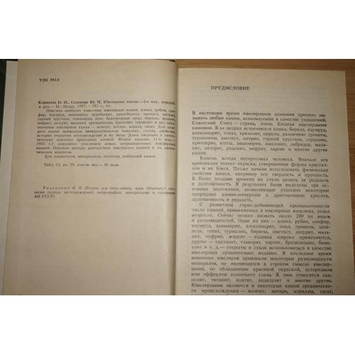 Описаны наиболее известные ювелирные камни: алмаз, корунд, хризоберилл, берилл, шпинель, гранат, топаз, турмалин, хризолит, кварц, благородный опал, бирюза, жадеит, нефрит, лазурит, малахит, родонит, пироксены, полевые шпаты, органогенные камни (жемчуг, янтарь, коралл, гагат), некоторые новые и редкие ювелирные камни. Для каждого камня приведены минералогическое описание, состав, свойства, история открытия местонахождений и их типы. Даны сведения о синтетических аналогах природных камней. Главы: Ювелирные камни в прошлом и настоящем. Классификация ювелирных камней. Методы диагностики ювелирных камней. Методы и техника обработки камней. Природные ювелирные камни. Синтетические ювелирные камни. Вес книги 465 гр.