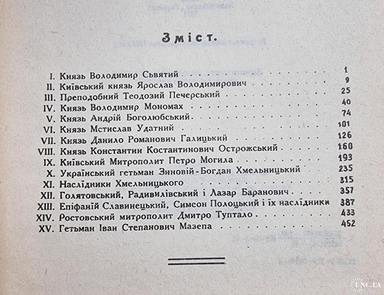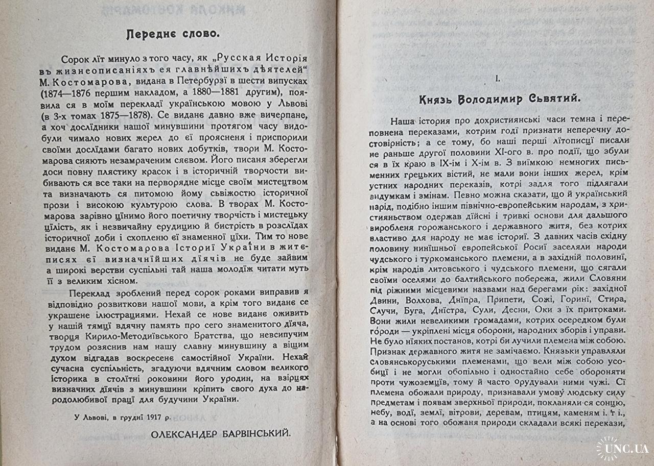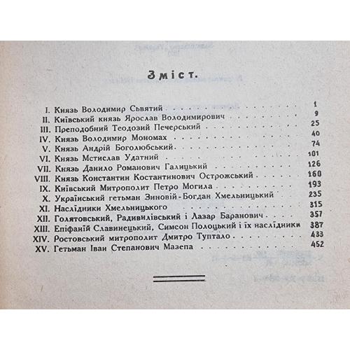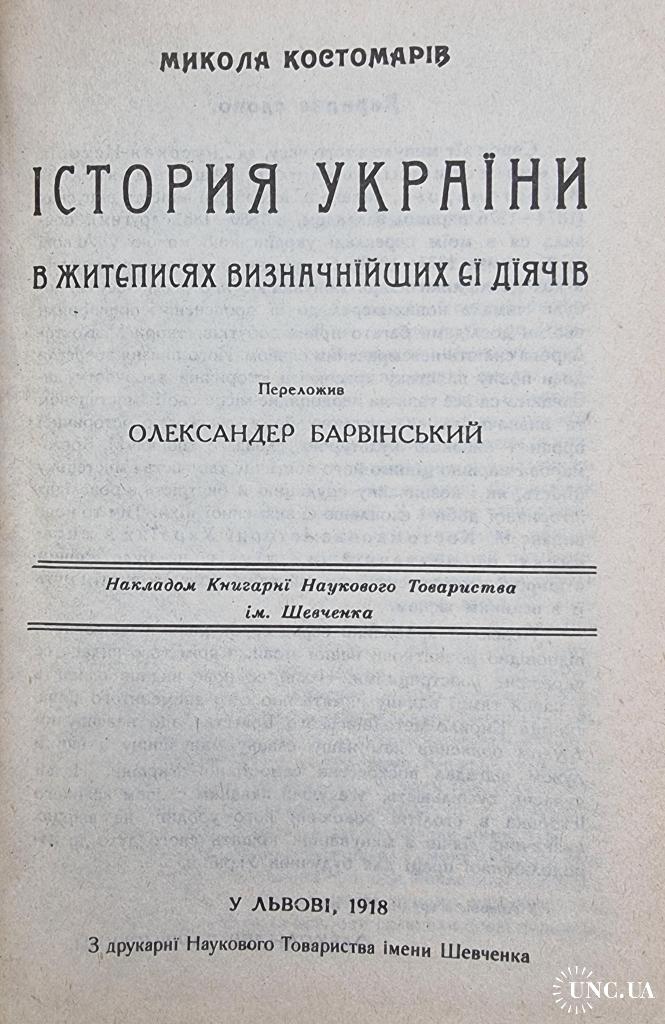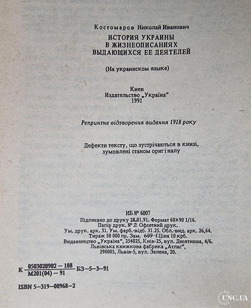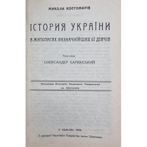 Костомарів Микола "Історія України в Життєписах Визначніших її діячів". Репринтне відтворення видання 1918 року у Львові. Переложив Олександр Барвінський. Київ видавництво "Україна", 1991 рік. 494 сторінки. Книга українською мовою.