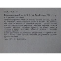 Систематизовано основні способи в'язання спицями, викладені різні елементи візерунків і техніка їх виконання. Описано побудову малюнків викрійок. Показані зразки моделей жіночих жакетів, светрів, суконь, костюмів, пальто і шарфів, а також деякі зразки дитячих та чоловічих в'язаних виробів.