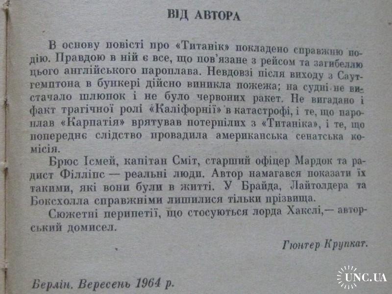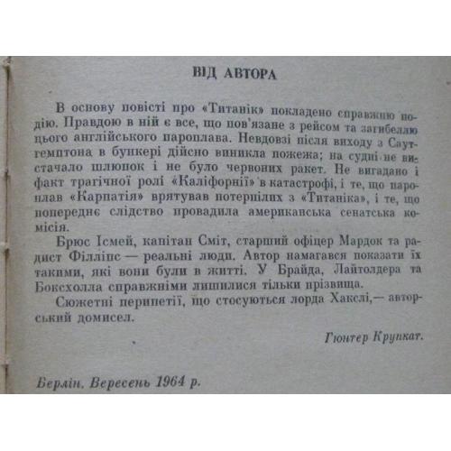 Німецький письменник Гюнтер Крупкат (НДР) в основу свого роману «Корабель приречених» поклав справжню подію — трагічну загибель знаменитого англійського корабля «Титанік"). Роман створен на матеріалах, узятих з повідомлень преси та розповідей очевидців. Ними були заповнені всі газети світу в квітневі дні 1912 року, коли англійський пароплав-велетень, зіткнувшись з айсбергом, затонув. Про причини, які призвели до жахливої трагедії, про те, як саме загинув «Титанік», і розповідає роман «Корабель приречених».