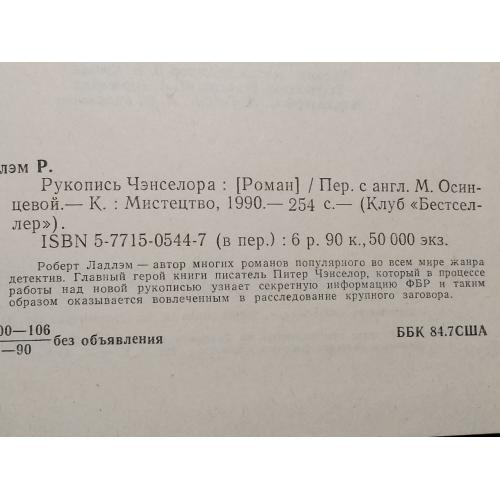 Ладлэм. Рукопись Чэнселора. Издательство Мыстэцтво Киев 1990 год. Отличное состояние