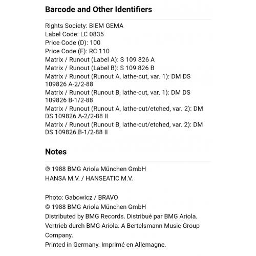 Вінілова платівка. Сьомий, в дискографії, студійний міні сингл (EP 7), Шотландського поп-рок музиканта, бувшого учасника групи Bay City Rollers, Les McKeown, який на той час працював з легендарним Дітером Боленем (She's A Lady) 1988. Випуск фірми (Hansa) Germany, 1988-ий рік. Оригінальне, рідне, першопресове, Німецьке видання. Стан платівки ЕХ+. Стан конверту VG+. Відправка по Україні службами доставки: Нова Пошта, Укр Пошта, Делівері. Також відправляємо посилки за кордон по цілому світу.