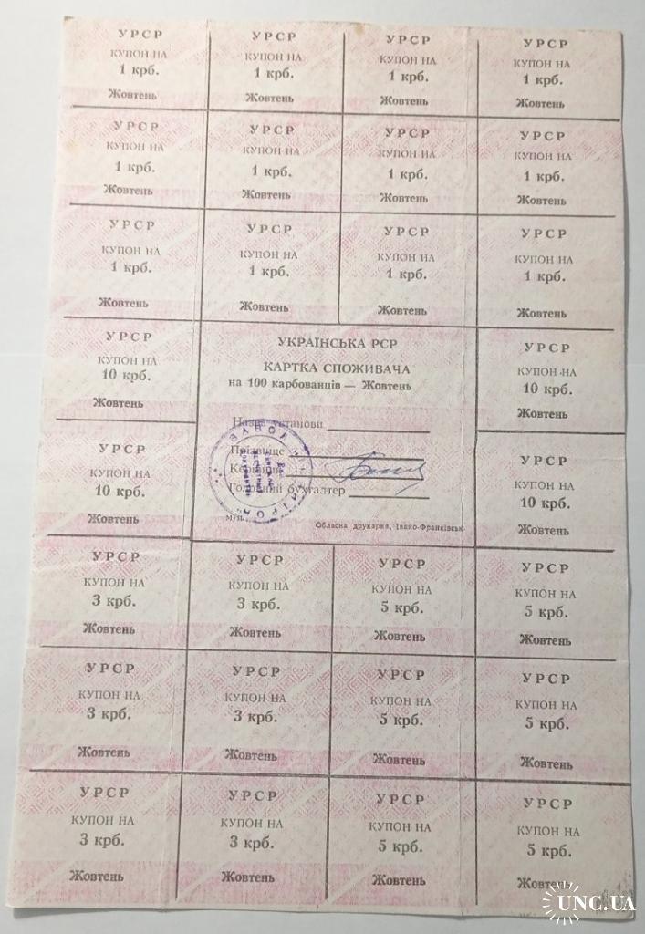 Лист купонів. Картка споживача. Карточка потребителей. Лист купонов. 100.