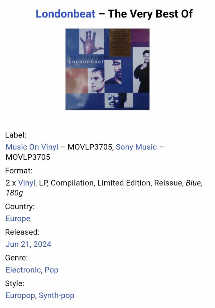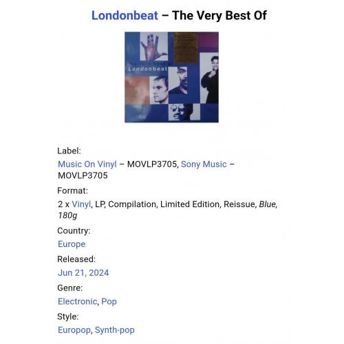 Вінілові платівки. Офіційна збірка найкращих хітів за всю дискографію, яка вийшла в 1997-му році, Британської денспоп групи Londonbeat, яка складалась з учасників Джиммі Хелмса, Джиммі Чемберса, Шарль П,єра, Вільяма Хенсхола, Джорджа Чендлера, Марка Голдшміца та Майлза Кейна (Very Best Of) 1988-94. Випуск фірми (Music On Vinyl / Sony Music) Europe, 2024-ий рік. Видання з двох платівок (2LP). Кольорові вініли (Coloured Vinyl). Лімітований тираж (Limited Edition). Видання нове, запаковане. Категорія S/S. Відправка по Україні службами доставки: Нова Пошта, Укр Пошта, Делівері. Також відправляємо посилки за кордон по цілому світу.