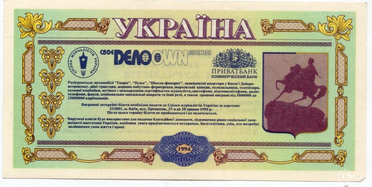лотерейный билет Благотворительная денежно-вещевая лотерея Свое дело 1994 Приватбанк