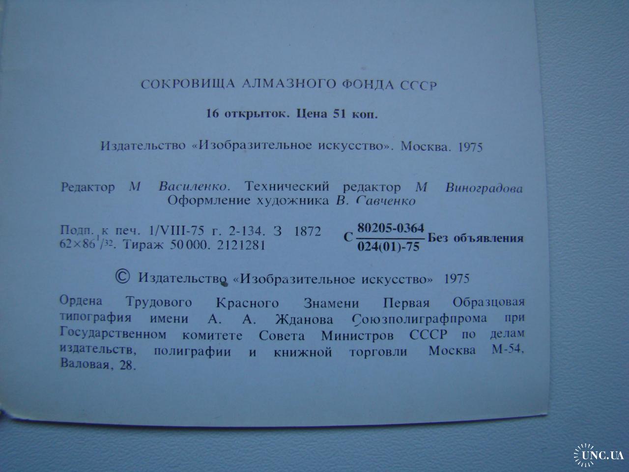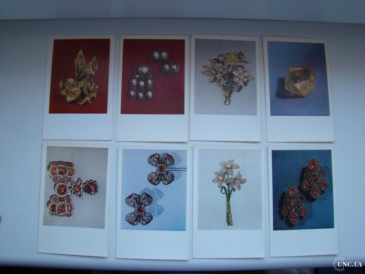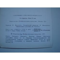 1961-1980Набор открыток в количестве 15 шт. в фирменной обложке в хорошем состоянии. На обороте каждой открытки на двух языках (русском и английском) есть описание предметов, изображенных на открытке. Тираж 50 тыс.экз. В коллекцию.