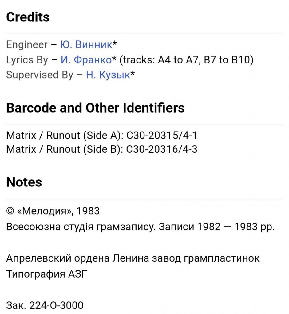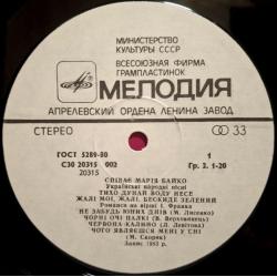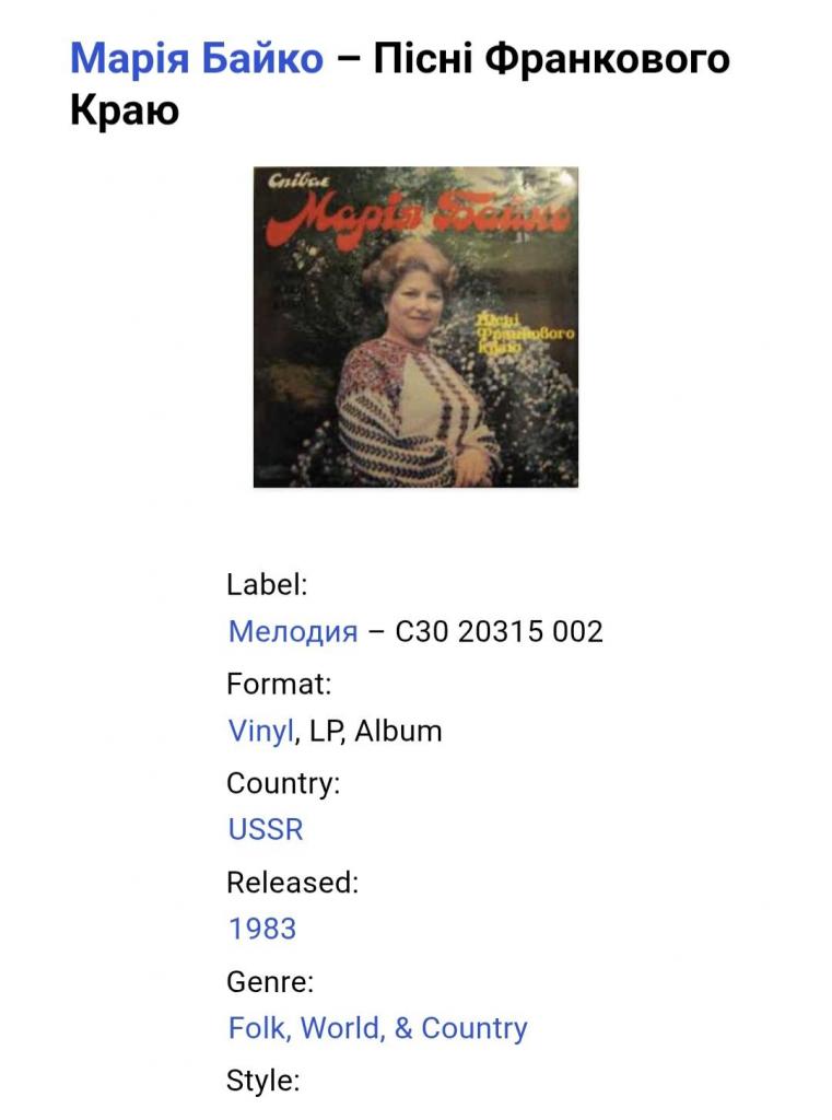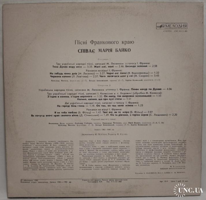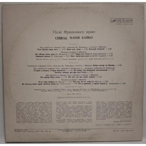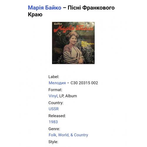 Вінілова платівка. Третій, в дискографії, студійний альбом Польсько-Української фольклорної виконавиці, Народної артиски України, професорки кафедри академічного співу Львівської музичної академії імені Миколи Лисенка, покійної вже, Марії Байко (Пісні Франкового Краю) 1983. Випуск фірми (Мелодія) СРСР, Апрелєвський завод грамплатівок, 1983-ій рік. Оригінальне, першопресове видання. Лімітований тираж (Limited Edition), Рідкісне (Rare). Стан платівки EX+. Стан конверту ЕХ+. Відправка по Україні службами доставки: Нова Пошта, Укр Пошта, Делівері. Також відправляємо посилки за кордон по цілому світу.
