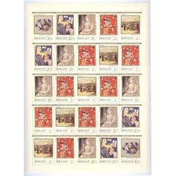 На марках картины: 1. Маковский "Деревенский рынок".2. Эдуард Леонидович Зеленин «Дама в шляпе» 1988 год, 3. Антонина Федоровна Сафронова "Портрет актрисы Надежды Баженовой" 1940 год, 4. Хуго Шайбер "Две женщины" 1925 год, 5. Россия. Завод Попова. Две тарелки и чайник. середина 19 века.