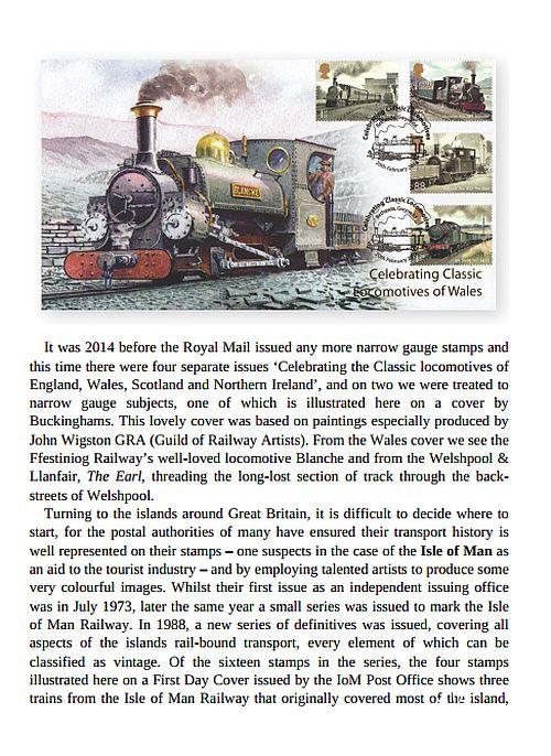 Автора давно интересовал вопрос, почему узкоколейные системы во всем мире требуют гораздо большего внимания со стороны общественности и производителей марок, чем железнодорожные темы со стандартной колеей, которые составляют подавляющее большинство основных железнодорожных систем западного мира. Вывод, к которому он пришел, заключается в том, что в большинстве случаев их считают «милые» поистине отвратительным термином, который (к счастью) постепенно исчезает из нашего словаря, но именно то, что почувствовал автор, впервые увидев паровозы Талиллинской железной дороги в центре Уэльса, с вершины станции приближаемся к станции Тайвинс-Уорф: крошечные чайники сверкающего насыщенного зеленого цвета и много латуни.